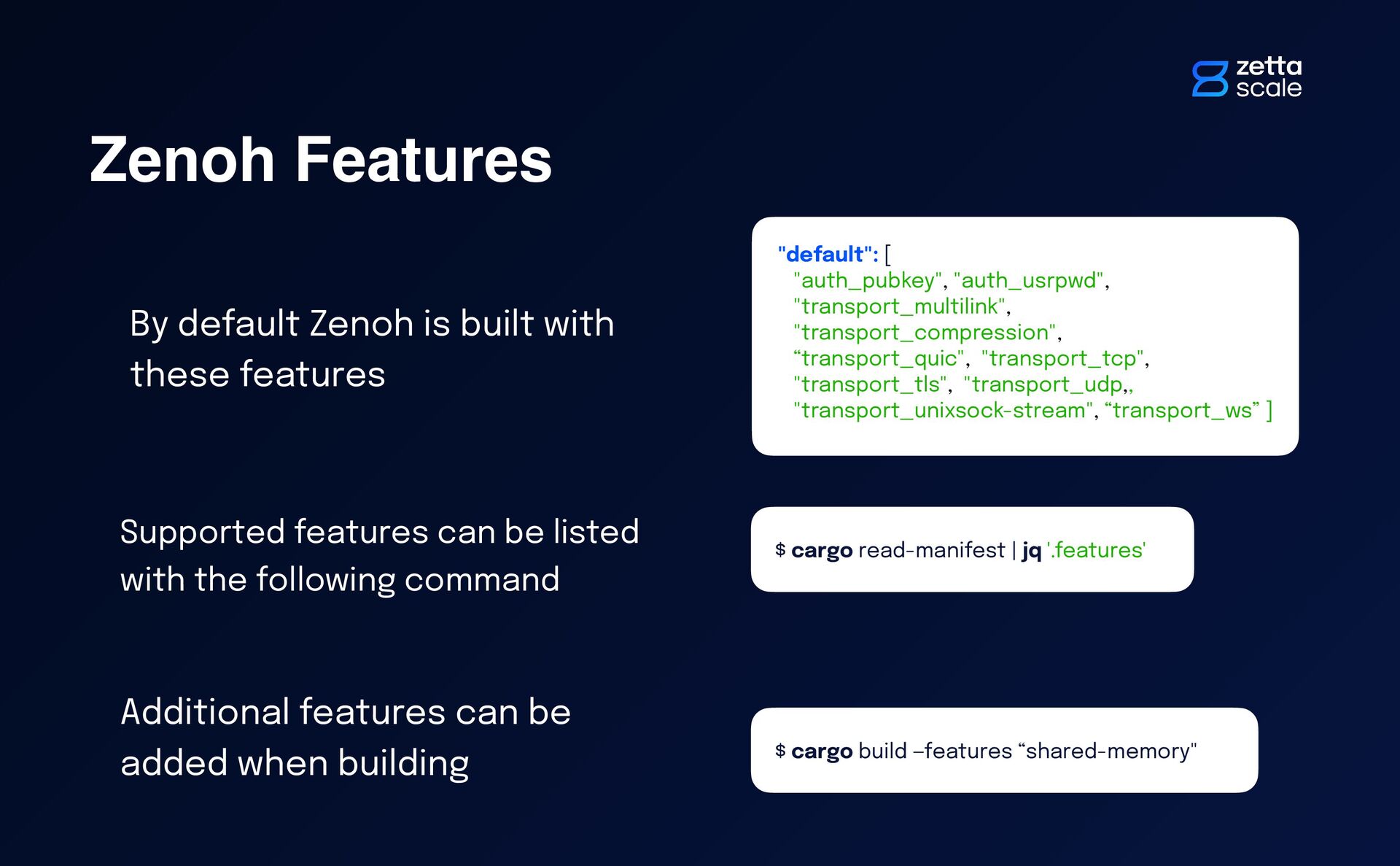 $ cargo read-manifest | jq '.features' "default": [ "auth_pubkey", "auth_usrpwd", "transport_multilink", "transport_compression", “transport_quic", "transport_tcp", "transport_tls", "transport_udp,, "transport_unixsock-stream", “transport_ws” ] Supported features can be listed with the following command Additional features can be added when building $ cargo build —features “shared-memory"