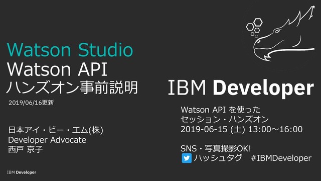 Watson API を使った セッション・ハンズオン 2019-06-15 (⼟) 13:00〜16:00 SNS・写真撮影OK! ハッシュタグ #IBMDeveloper 2019/06/16更新