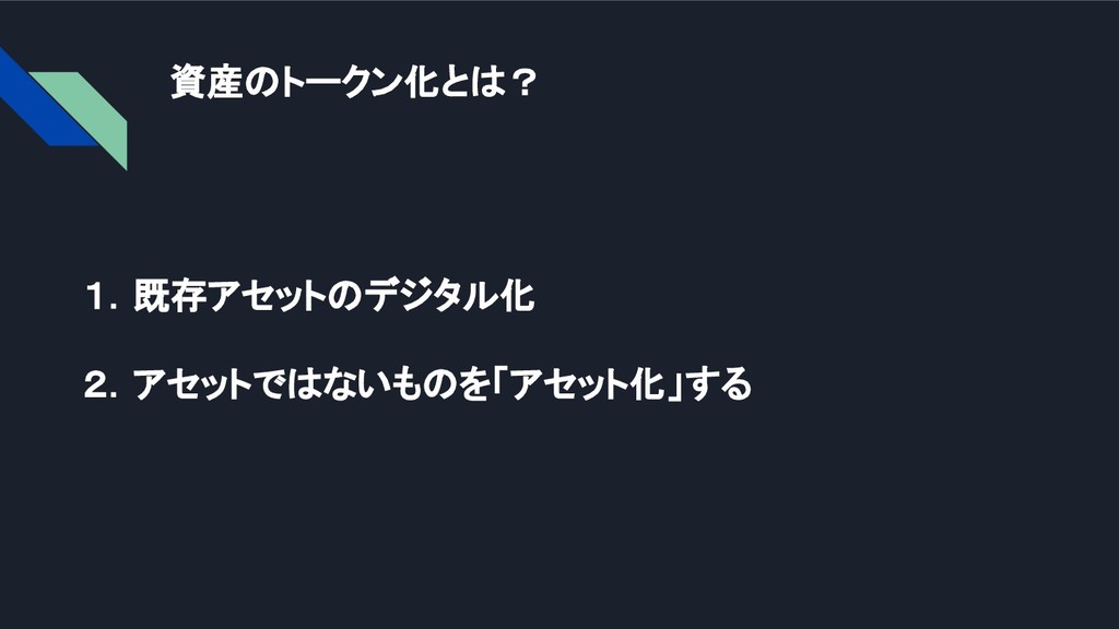 資産のトークン化とは? 1.既存アセットのデジタル化 2.アセットではないものを「アセット化」する