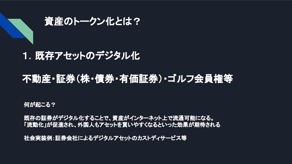 1.既存アセットのデジタル化 不動産・証券(株・債券・有価証券)・ゴルフ会員権等 何が起こる? 既存の証券がデジタル化することで、資産がインターネット上で流通可能になる。 「流動化」が促進され、外国人もアセットを買いやすくなるといった効果が期待される 社会実装例:証券会社によるデジタルアセットのカストディサービス等 資産のトークン化とは?