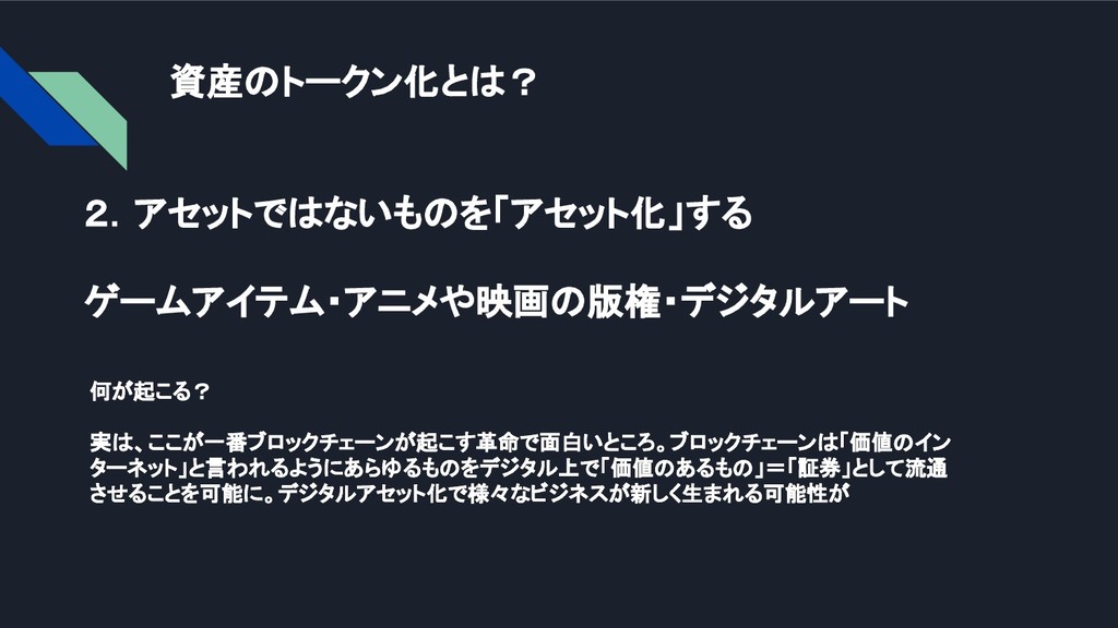 2.アセットではないものを「アセット化」する ゲームアイテム・アニメや映画の版権・デジタルアート 何が起こる? 実は、ここが一番ブロックチェーンが起こす革命で面白いところ。ブロックチェーンは「価値のイン ターネット」と言われるようにあらゆるものをデジタル上で「価値のあるもの」=「証券」として流通 させることを可能に。デジタルアセット化で様々なビジネスが新しく生まれる可能性が 資産のトークン化とは?