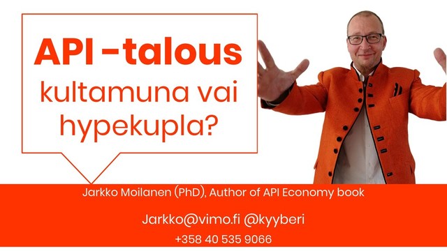 APIs Open API Public API Partner API Yes Yes No No Yes Yes Yes No Yes Maybe Maybe No Yes Maybe No No Available for anyone to register? Public support available for adopting API? Pay for usage? Open license for data? Marjukka Niinioja & Jarkko Moilanen, API-talous 101 (2018) Let’s play API darts!