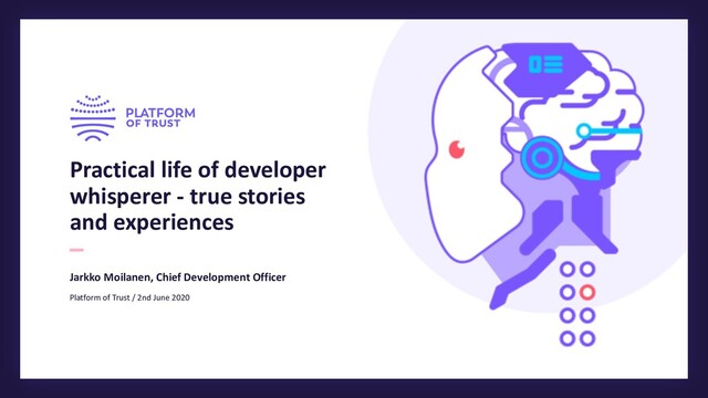 with help of external developers AIM: Under 4 minute long introduction video to Platform of Trust offering for developers • Low-Cost development model for video content • Discussion in Twitter DMs with 2 devs. Trust between participants had been built over years • Joint development during one Saturday • PoC voice-over with Amazon Polly • Developer opinion “Rubbish!” • One developer did voice-over at home • Refined the texts as well @Jarkko_Moilanen