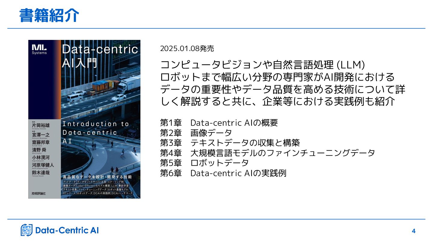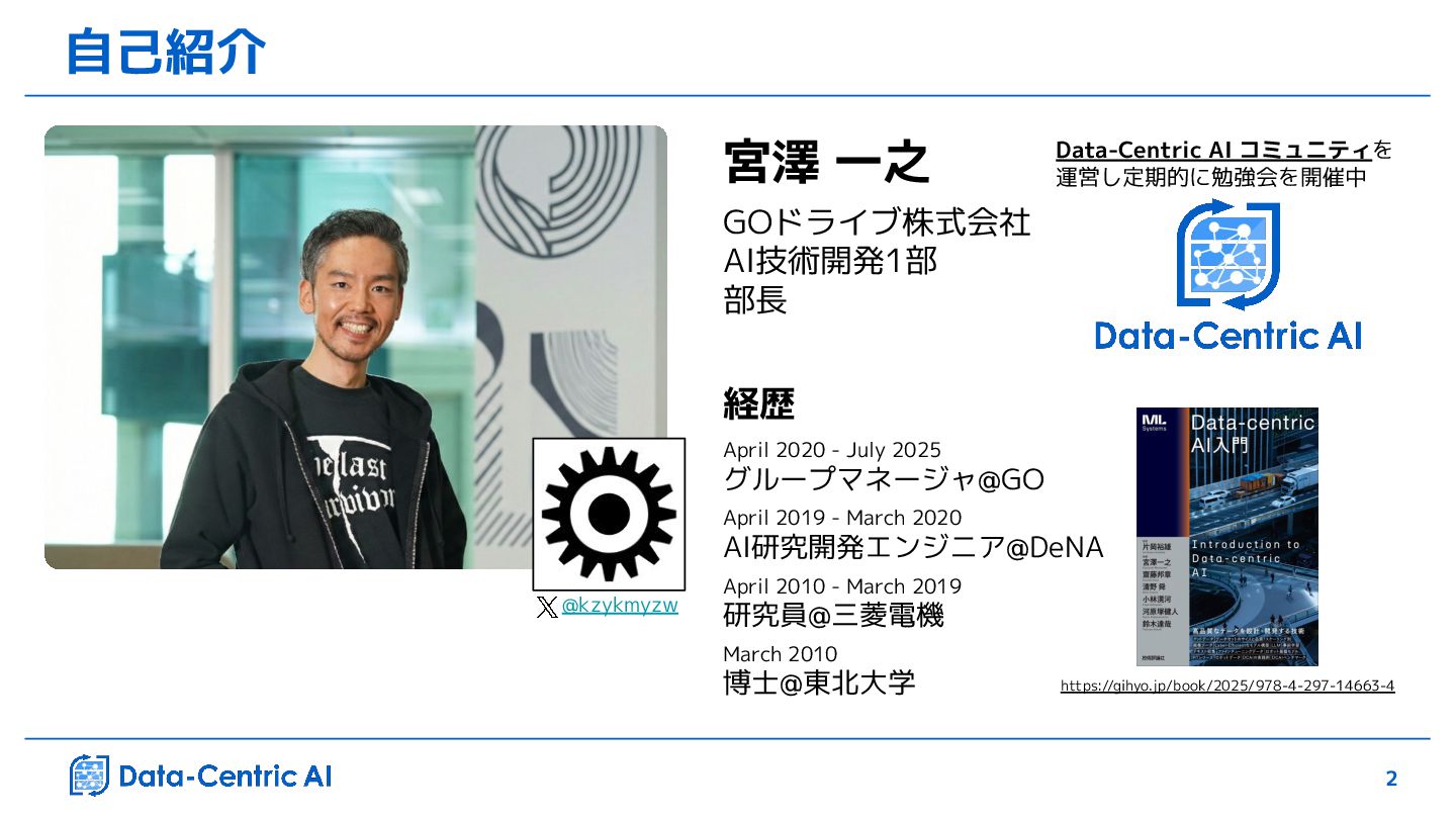 2020 - July 2025 グループマネージャ@GO April 2019 - March 2020 AI研究開発エンジニア@DeNA April 2010 - March 2019 研究員@三菱電機 March 2010 博士@東北大学 https://gihyo.jp/book/2025/978-4-297-14663-4 Data-Centric AI コミュニティを 運営し定期的に勉強会を開催中