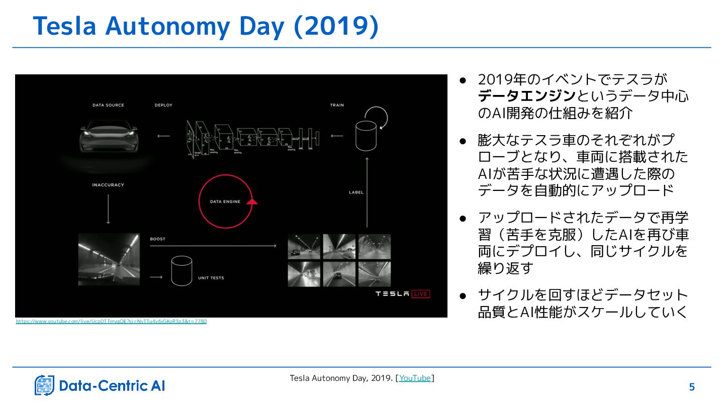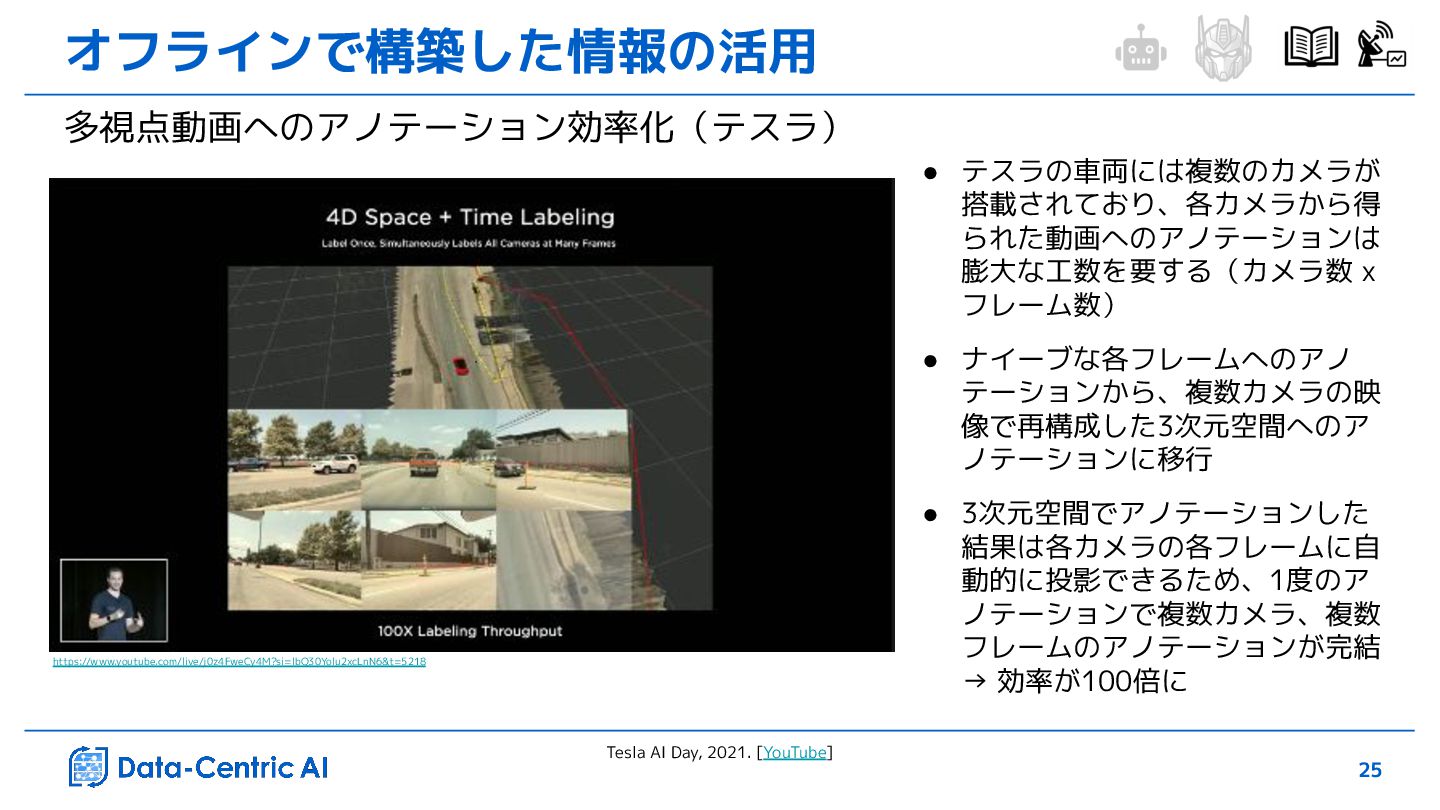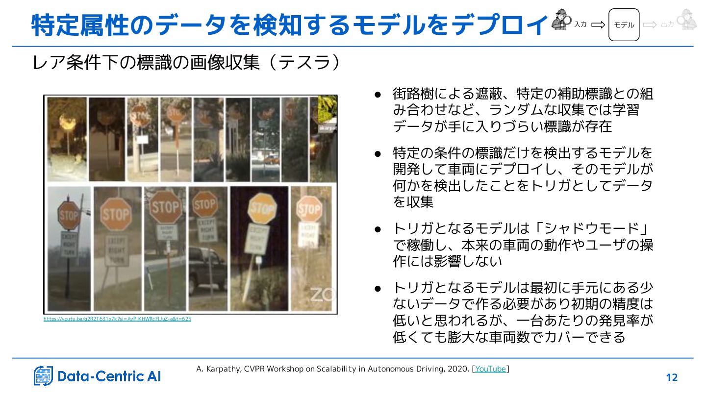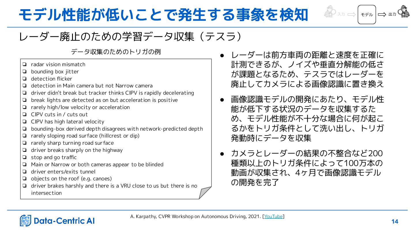 廃止してカメラによる画像認識に置き換え • 画像認識モデルの開発にあたり、モデル性 能が低下する状況のデータを収集するた め、モデル性能が不十分な場合に何が起こ るかをトリガ条件として洗い出し、トリガ 発動時にデータを収集 • カメラとレーダーの結果の不整合など200 種類以上のトリガ条件によって100万本の 動画が収集され、4ヶ月で画像認識モデル の開発を完了 ❏ radar vision mismatch ❏ bounding box jitter ❏ detection flicker ❏ detection in Main camera but not Narrow camera ❏ driver didn't break but tracker thinks CIPV is rapidly decelerating ❏ break lights are detected as on but acceleration is positive ❏ rarely high/low velocity or acceleration ❏ CIPV cuts in / cuts out ❏ CIPV has high lateral velocity ❏ bounding-box derived depth disagrees with network-predicted depth ❏ rarely sloping road surface (hillcrest or dip) ❏ rarely sharp turning road surface ❏ driver breaks sharply on the highway ❏ stop and go traffic ❏ Main or Narrow or both cameras appear to be blinded ❏ driver enters/exits tunnel ❏ objects on the roof (e.g. canoes) ❏ driver brakes harshly and there is a VRU close to us but there is no intersection データ収集のためのトリガの例 A. Karpathy, CVPR Workshop on Autonomous Driving, 2021. [YouTube]
