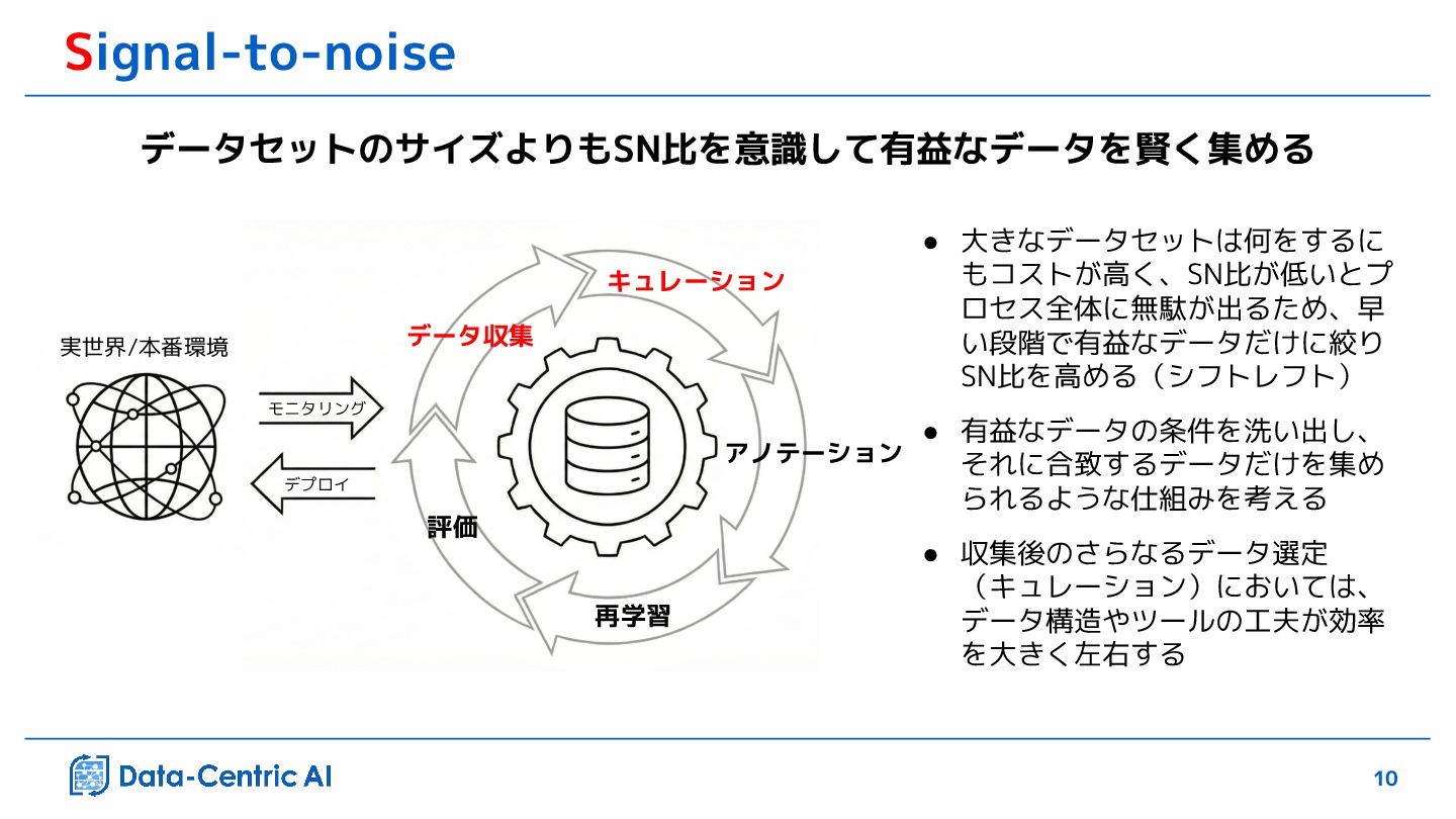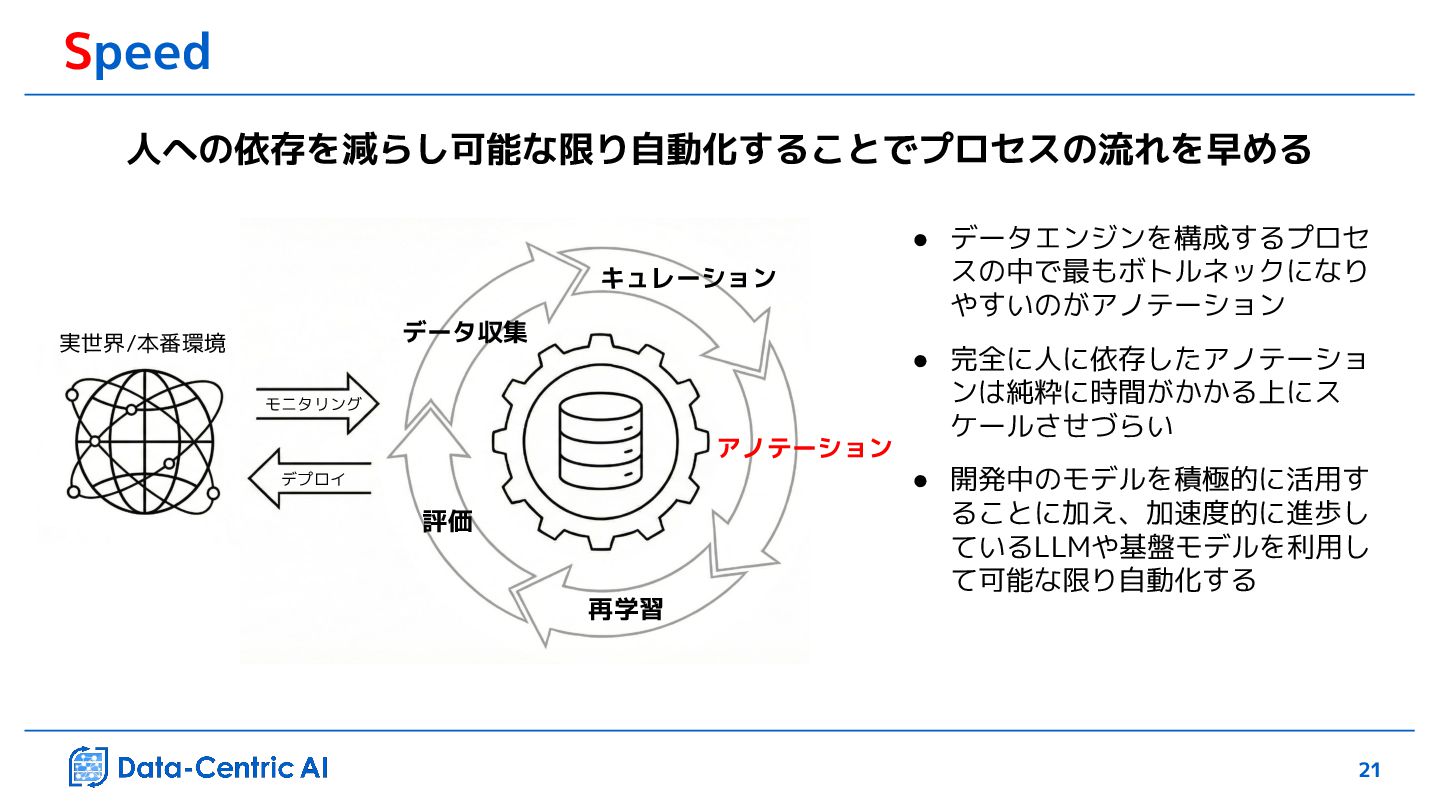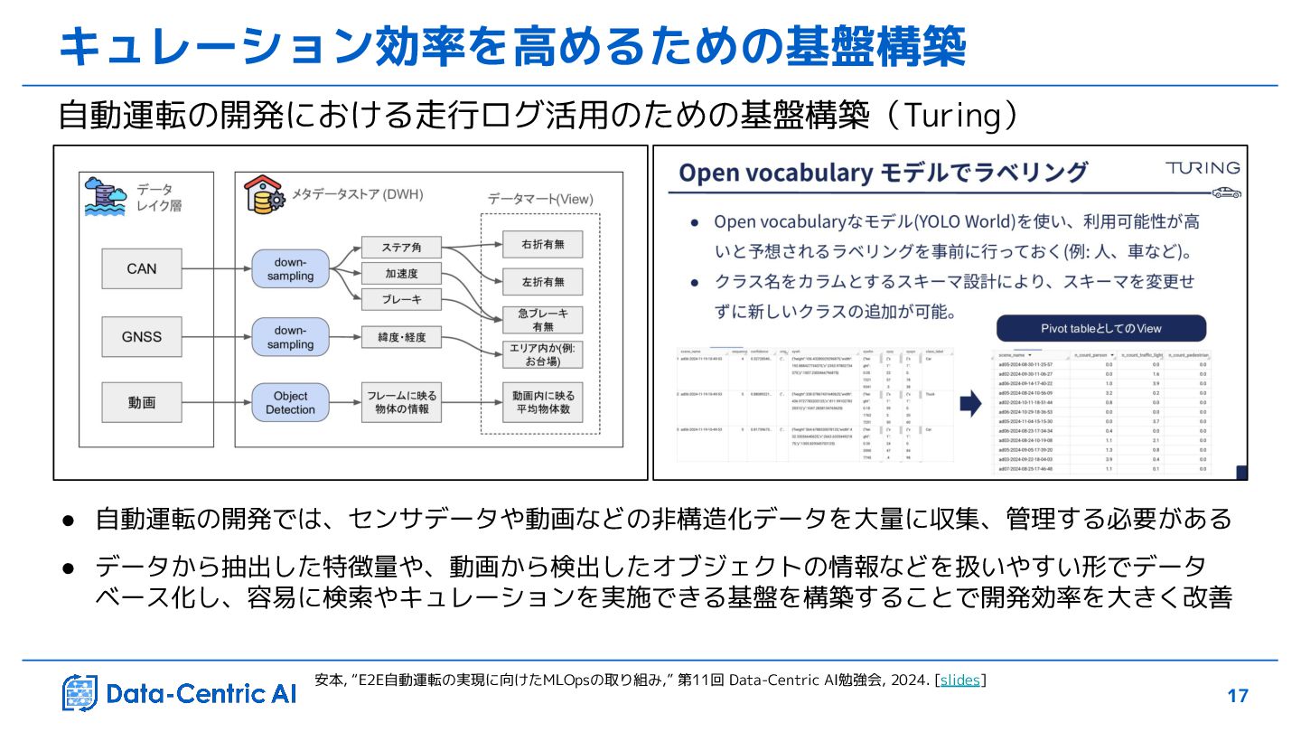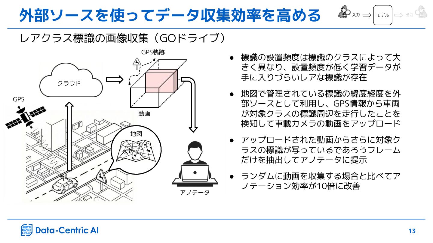 廃止してカメラによる画像認識に置き換え • 画像認識モデルの開発にあたり、モデル性 能が低下する状況のデータを収集するた め、モデル性能が不十分な場合に何が起こ るかをトリガ条件として洗い出し、トリガ 発動時にデータを収集 • カメラとレーダーの結果の不整合など200 種類以上のトリガ条件によって100万本の 動画が収集され、4ヶ月で画像認識モデル の開発を完了 ❏ radar vision mismatch ❏ bounding box jitter ❏ detection flicker ❏ detection in Main camera but not Narrow camera ❏ driver didn't break but tracker thinks CIPV is rapidly decelerating ❏ break lights are detected as on but acceleration is positive ❏ rarely high/low velocity or acceleration ❏ CIPV cuts in / cuts out ❏ CIPV has high lateral velocity ❏ bounding-box derived depth disagrees with network-predicted depth ❏ rarely sloping road surface (hillcrest or dip) ❏ rarely sharp turning road surface ❏ driver breaks sharply on the highway ❏ stop and go traffic ❏ Main or Narrow or both cameras appear to be blinded ❏ driver enters/exits tunnel ❏ objects on the roof (e.g. canoes) ❏ driver brakes harshly and there is a VRU close to us but there is no intersection データ収集のためのトリガの例 A. Karpathy, CVPR Workshop on Autonomous Driving, 2021. [YouTube]
