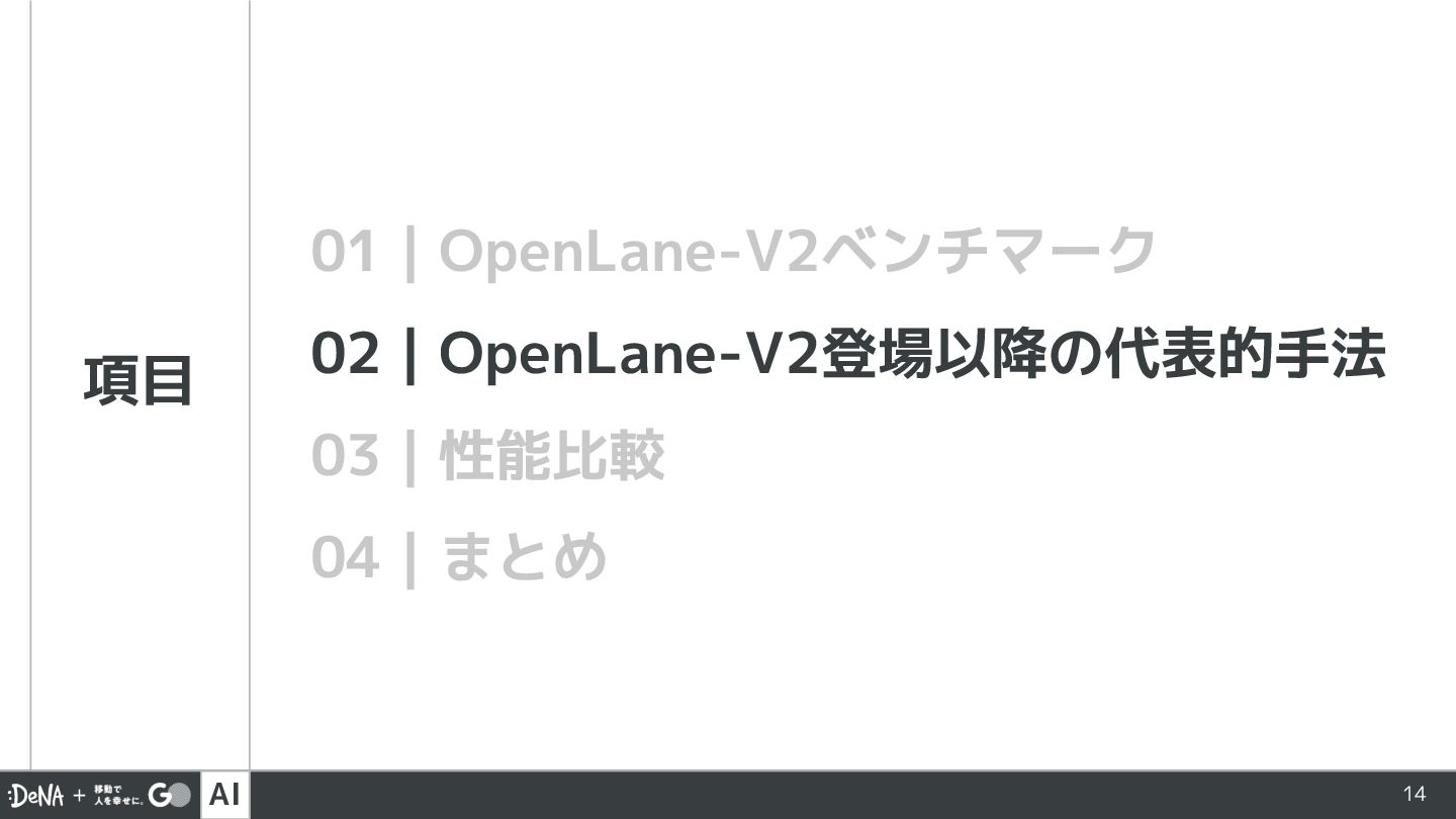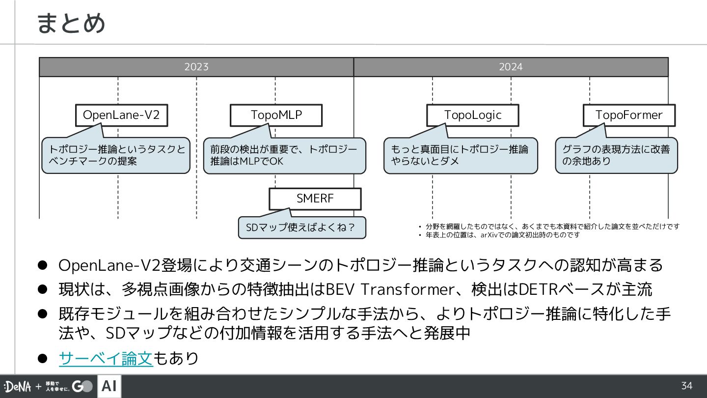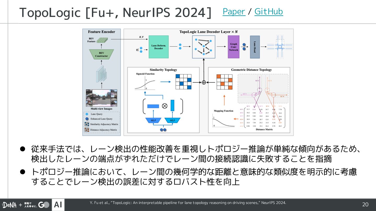 従来手法では、レーン検出の性能改善を重視しトポロジー推論が単純な傾向があるため、 検出したレーンの端点がずれただけでレーン間の接続認識に失敗することを指摘 l トポロジー推論において、レーン間の幾何学的な距離と意味的な類似度を明示的に考慮 することでレーン検出の誤差に対するロバスト性を向上 Y. Fu et al., “TopoLogic: An interpretable pipeline for lane topology reasoning on driving scenes,” NeurIPS 2024.