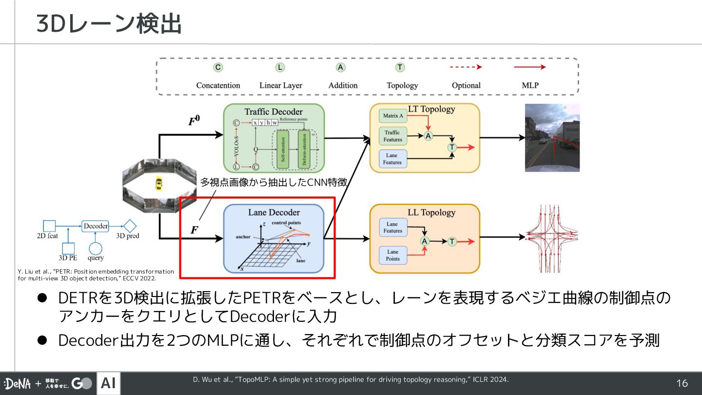 transformation for multi-view 3D object detection,” ECCV 2022. l DETRを3D検出に拡張したPETRをベースとし、レーンを表現するベジエ曲線の制御点の アンカーをクエリとしてDecoderに入力 l Decoder出力を2つのMLPに通し、それぞれで制御点のオフセットと分類スコアを予測 多視点画像から抽出したCNN特徴 D. Wu et al., “TopoMLP: A simple yet strong pipeline for driving topology reasoning,” ICLR 2024.