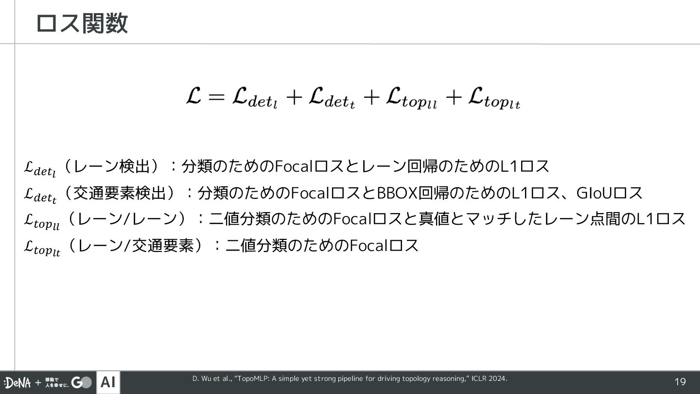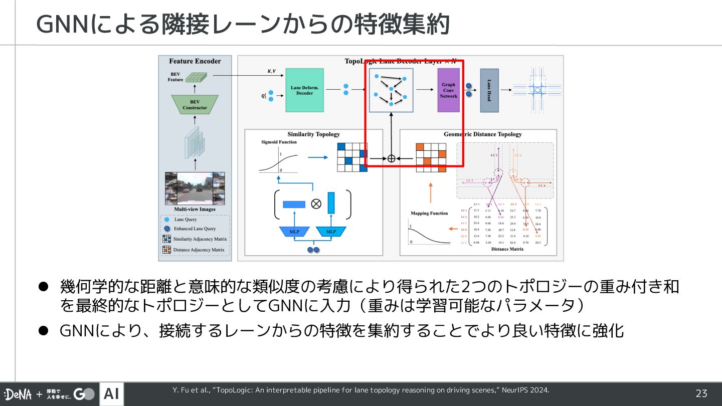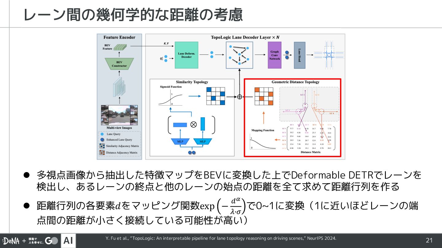 !+ &'( で0~1に変換(1に近いほどレーンの端 点間の距離が小さく接続している可能性が高い) Y. Fu et al., “TopoLogic: An interpretable pipeline for lane topology reasoning on driving scenes,” NeurIPS 2024.