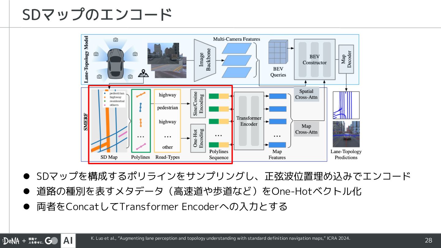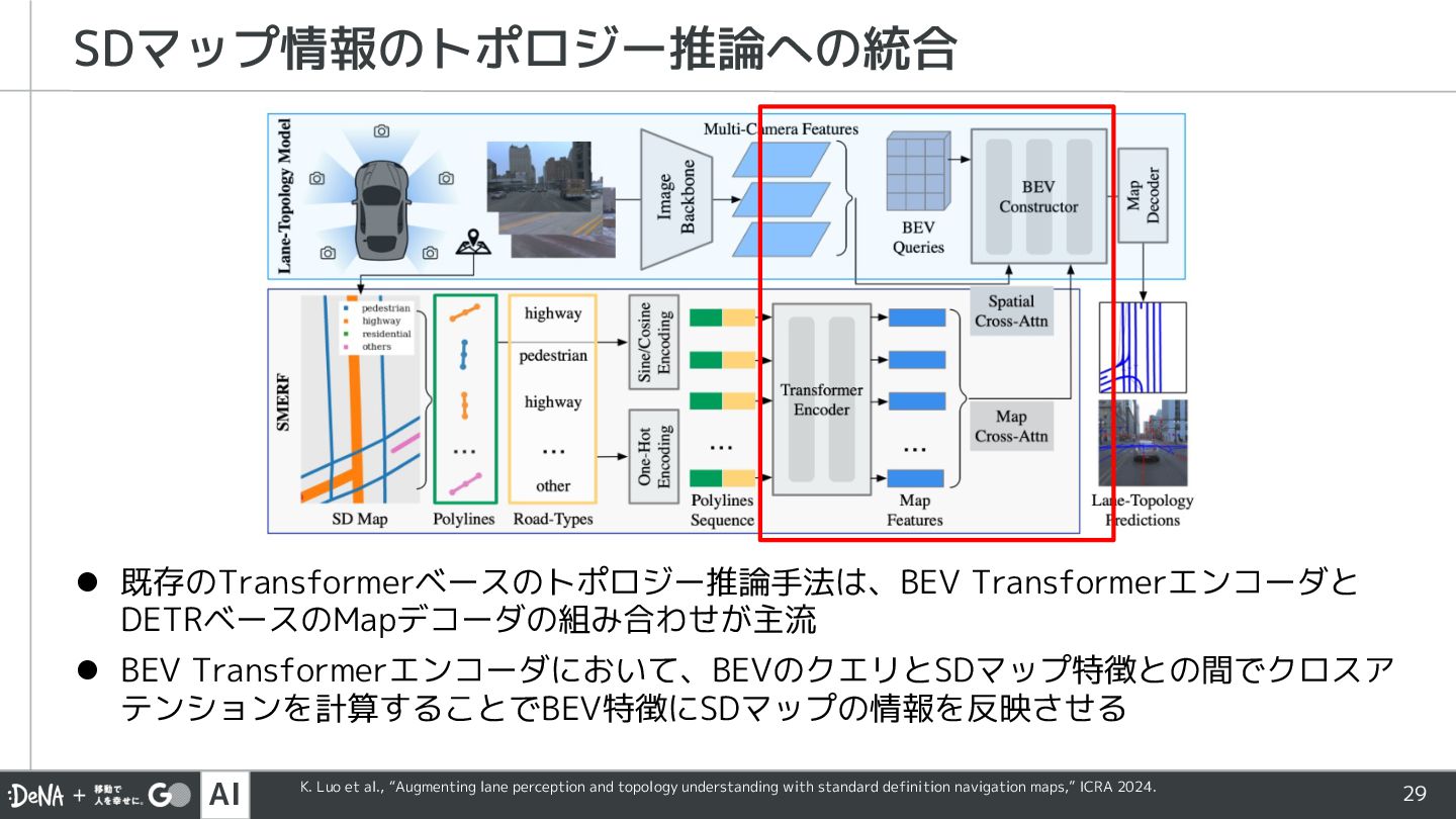 Encoder Representations from transFormers) を提案し、SDマップを事前知識として活用する ことでトポロジー推論の性能を改善 l Transformerベースであればどのようなトポロジー推論手法にも組み込み可能 Paper / GitHub / Project レーンレベルの詳細な 幾何的/意味的情報を持 つHDマップに比べ、SD マップは道路レベルの 情報程度しか持たない K. Luo et al., “Augmenting lane perception and topology understanding with standard definition navigation maps,” ICRA 2024.