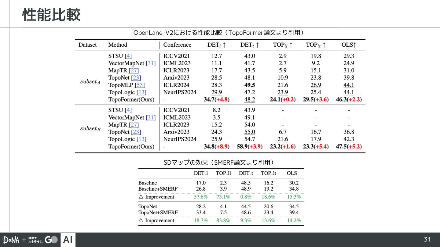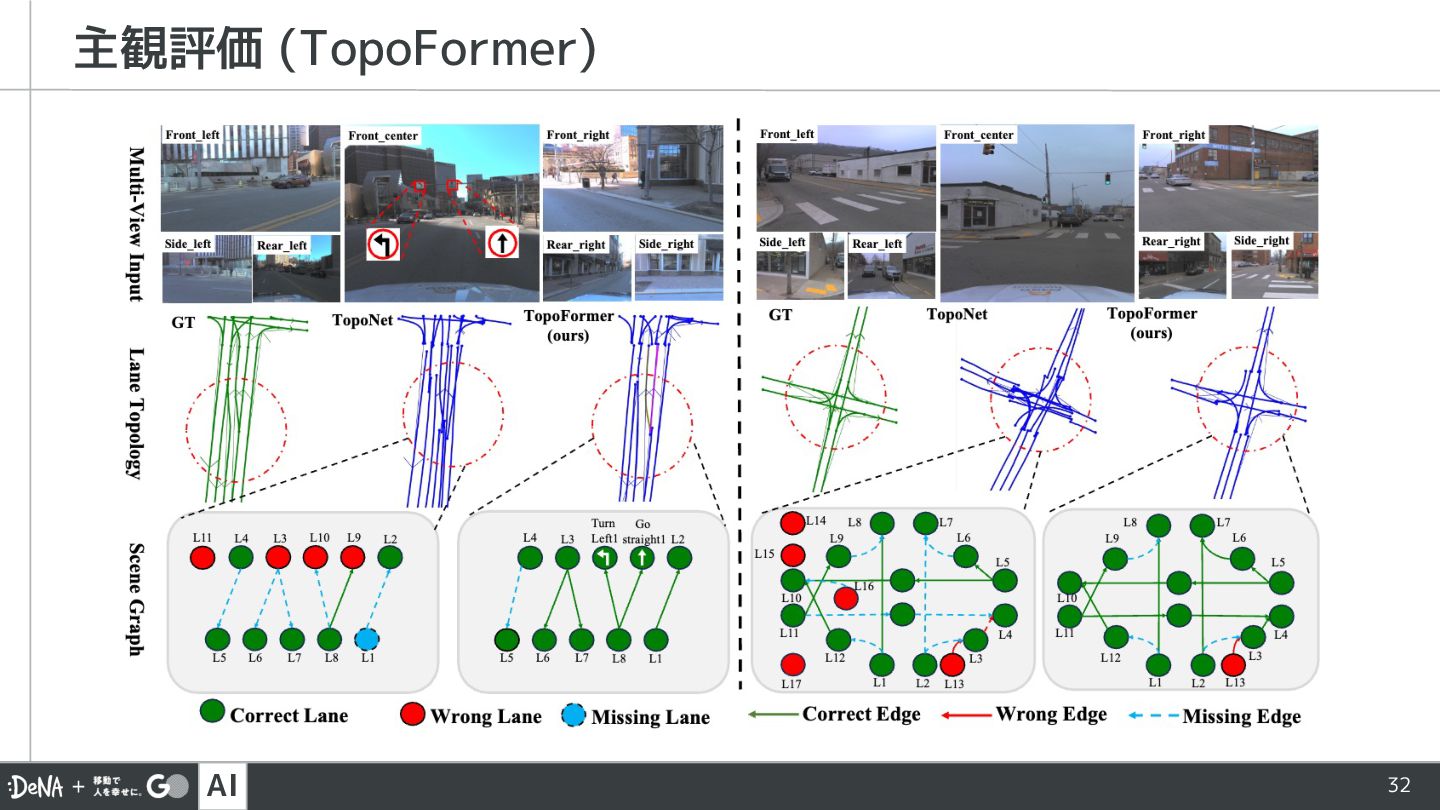 3Dレーン検出の精度 交通要素認識の精度 トポロジー推論(レーンとレーン)の精度 トポロジー推論(レーンと交通要素)の精度 𝑓(𝑥)はスケーリング関数 H. Wang et al., “OpenLane-V2: A topology reasoning benchmark for unified 3D HD mapping,” NeurIPS 2023. ※ 評価尺度に欠陥があることが指摘され、2023年11月に修正されている点に注意