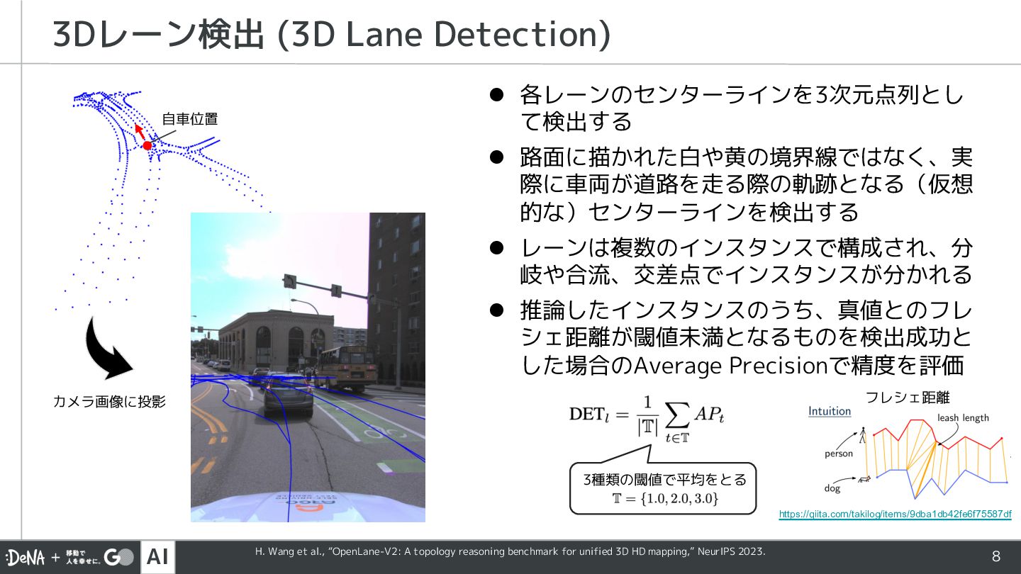 て検出する l 路面に描かれた白や黄の境界線ではなく、実 際に車両が道路を走る際の軌跡となる(仮想 的な)センターラインを検出する l レーンは複数のインスタンスで構成され、分 岐や合流、交差点でインスタンスが分かれる l 推論したインスタンスのうち、真値とのフレ シェ距離が閾値未満となるものを検出成功と した場合のAverage Precisionで精度を評価 フレシェ距離 https://qiita.com/takilog/items/9dba1db42fe6f75587df 3種類の閾値で平均をとる H. Wang et al., “OpenLane-V2: A topology reasoning benchmark for unified 3D HD mapping,” NeurIPS 2023.