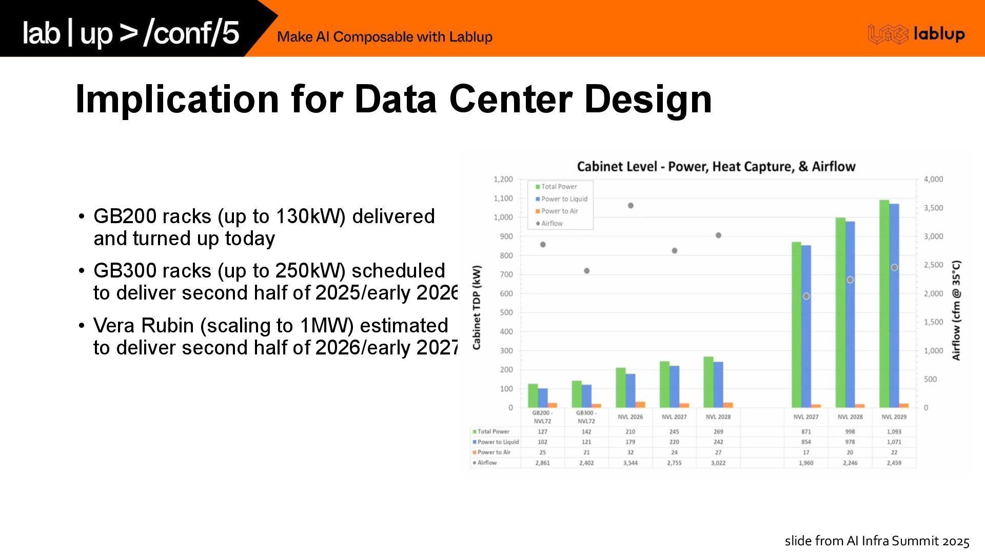 130kW) delivered and turned up today • GB300 racks (up to 250kW) scheduled to deliver second half of 2025/early 2026 • Vera Rubin (scaling to 1MW) estimated to deliver second half of 2026/early 2027 slide from AI Infra Summit 2025