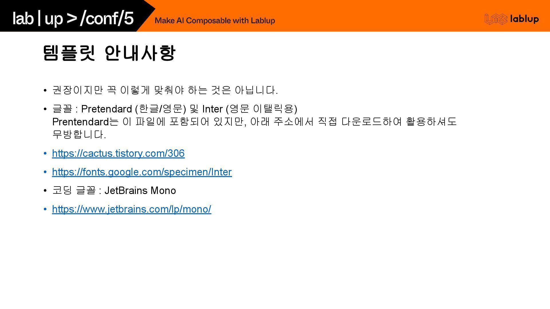 • 글꼴 : Pretendard (한글/영문) 및 Inter (영문 이탤릭용) Prentendard는 이 파일에 포함되어 있지만, 아래 주소에서 직접 다운로드하여 활용하셔도 무방합니다. • https://cactus.tistory.com/306 • https://fonts.google.com/specimen/Inter • 코딩 글꼴 : JetBrains Mono • https://www.jetbrains.com/lp/mono/