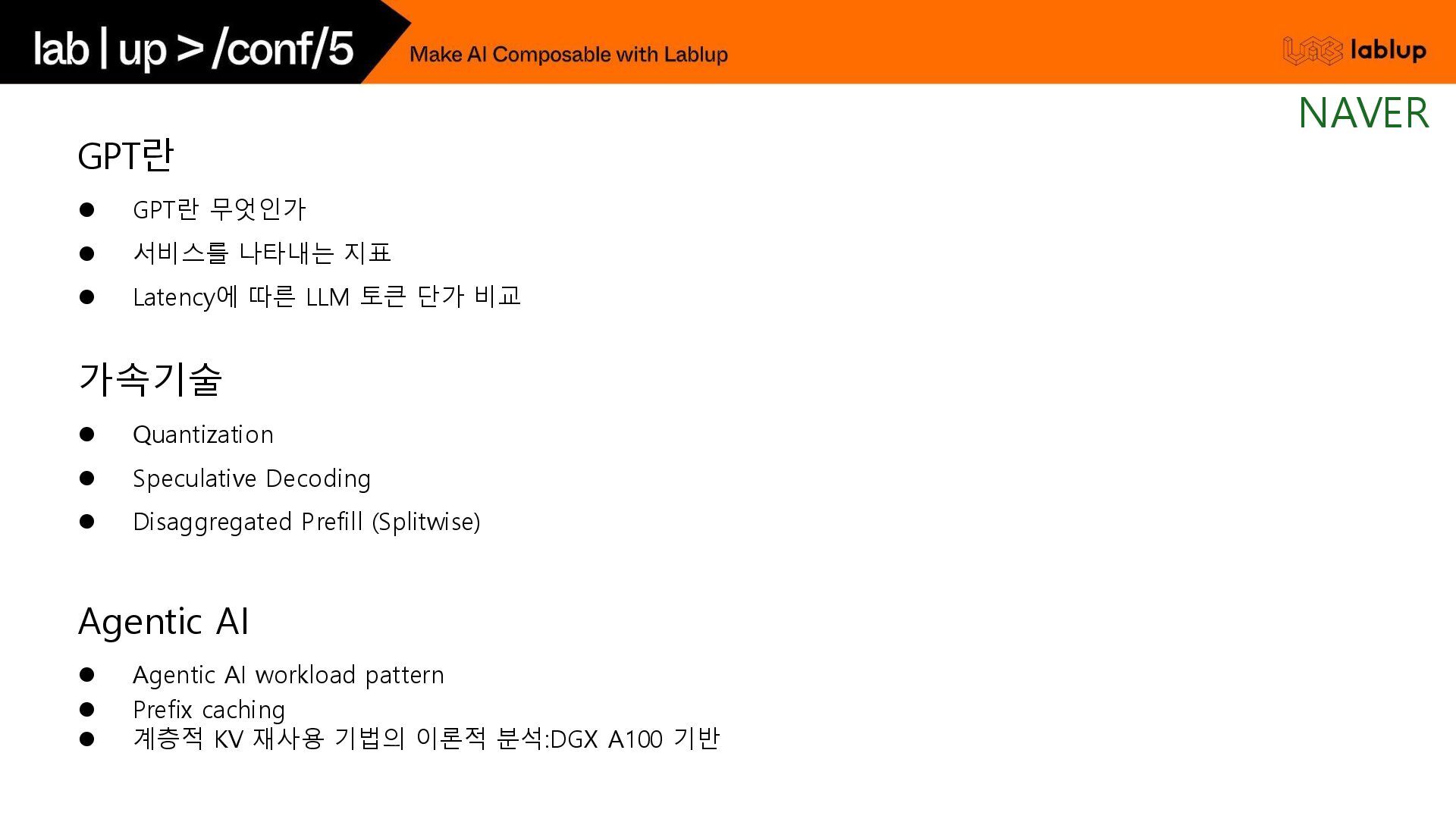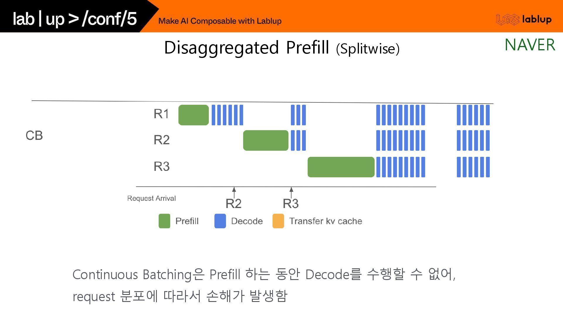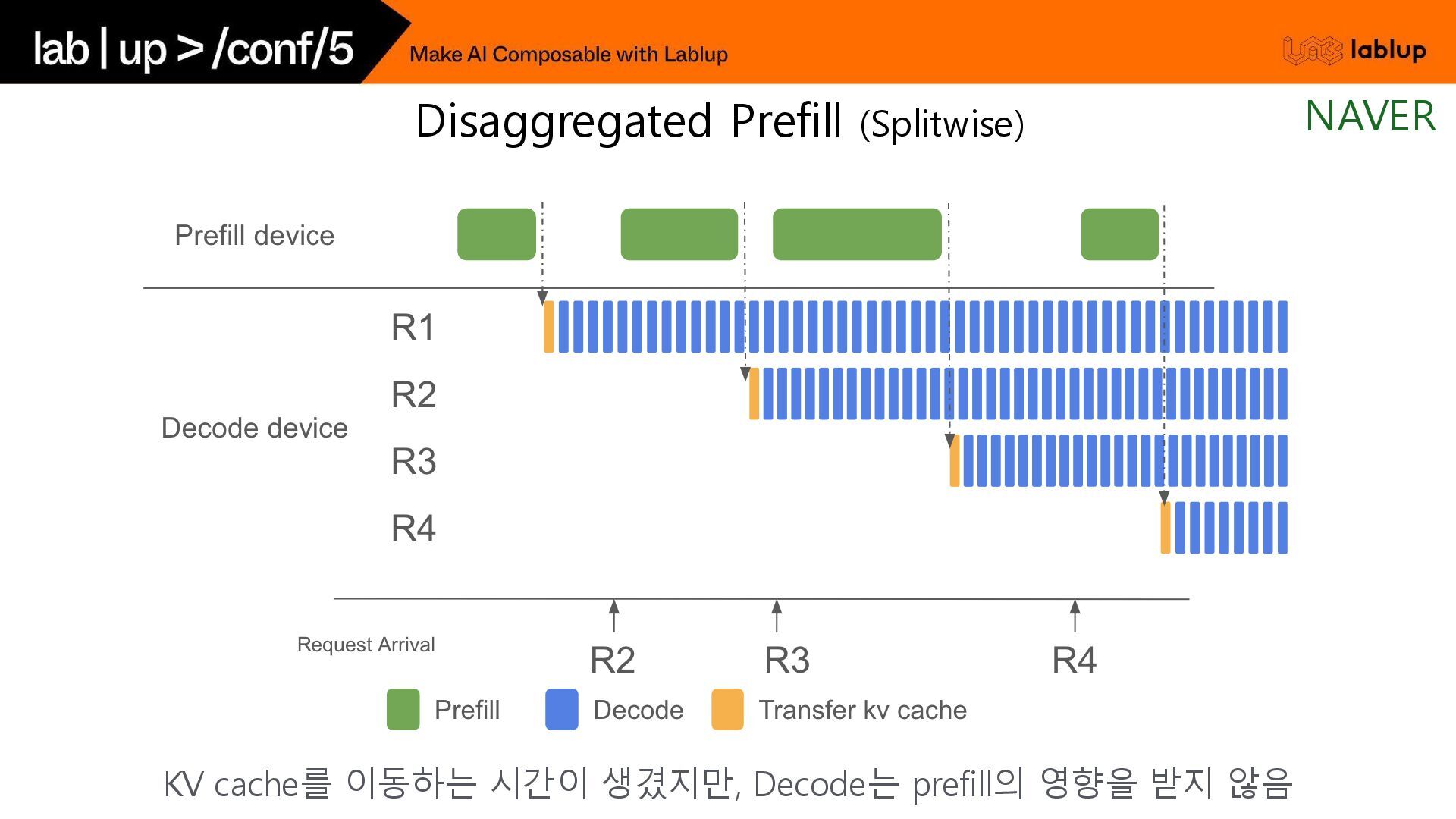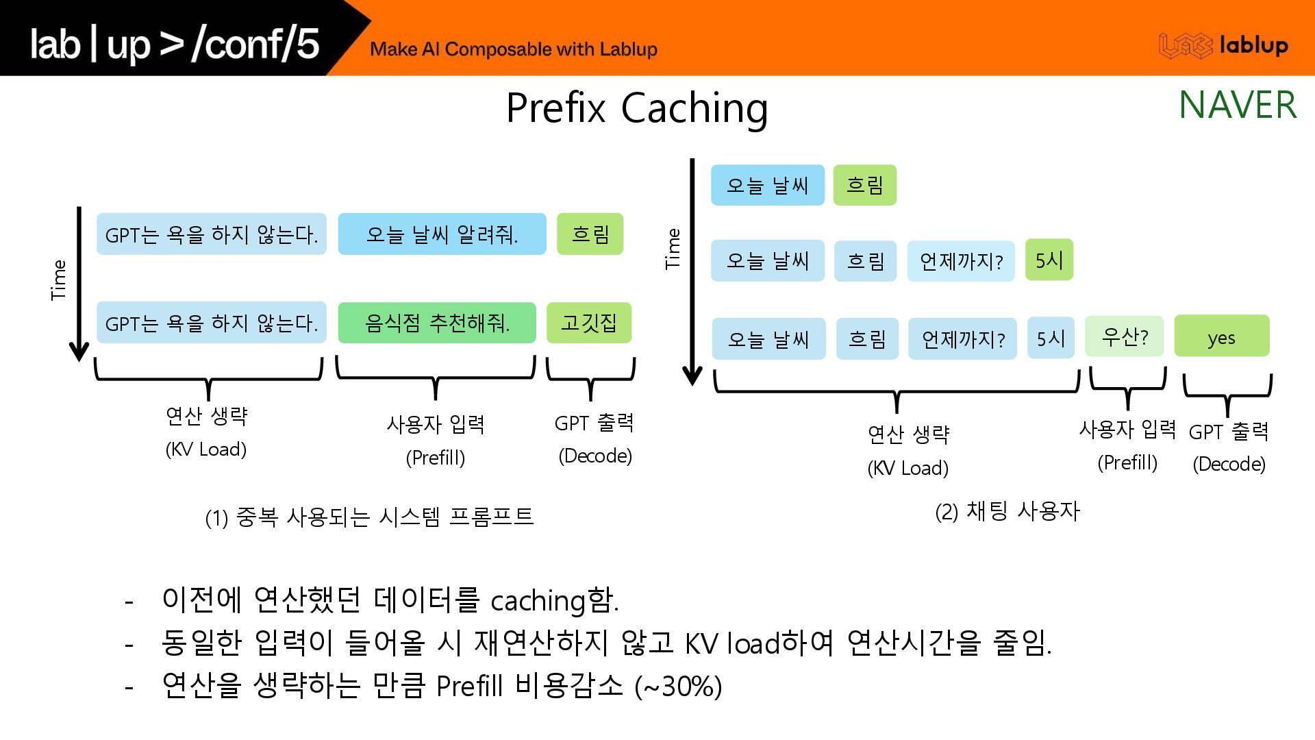 재연산하지 않고 KV load하여 연산시간을 줄임. - 연산을 생략하는 만큼 Prefill 비용감소 (~30%) 오늘 날씨 흐림 Time (2) 채팅 사용자 언제까지? 5시 오늘 날씨 흐림 언제까지? 5시 오늘 날씨 흐림 우산? yes 연산 생략 (KV Load) 사용자 입력 (Prefill) GPT 출력 (Decode) GPT는 욕을 하지 않는다. 오늘 날씨 알려줘. 흐림 GPT는 욕을 하지 않는다. Time (1) 중복 사용되는 시스템 프롬프트 사용자 입력 (Prefill) GPT 출력 (Decode) 음식점 추천해줘. 고깃집 연산 생략 (KV Load) Prefix Caching NAVER