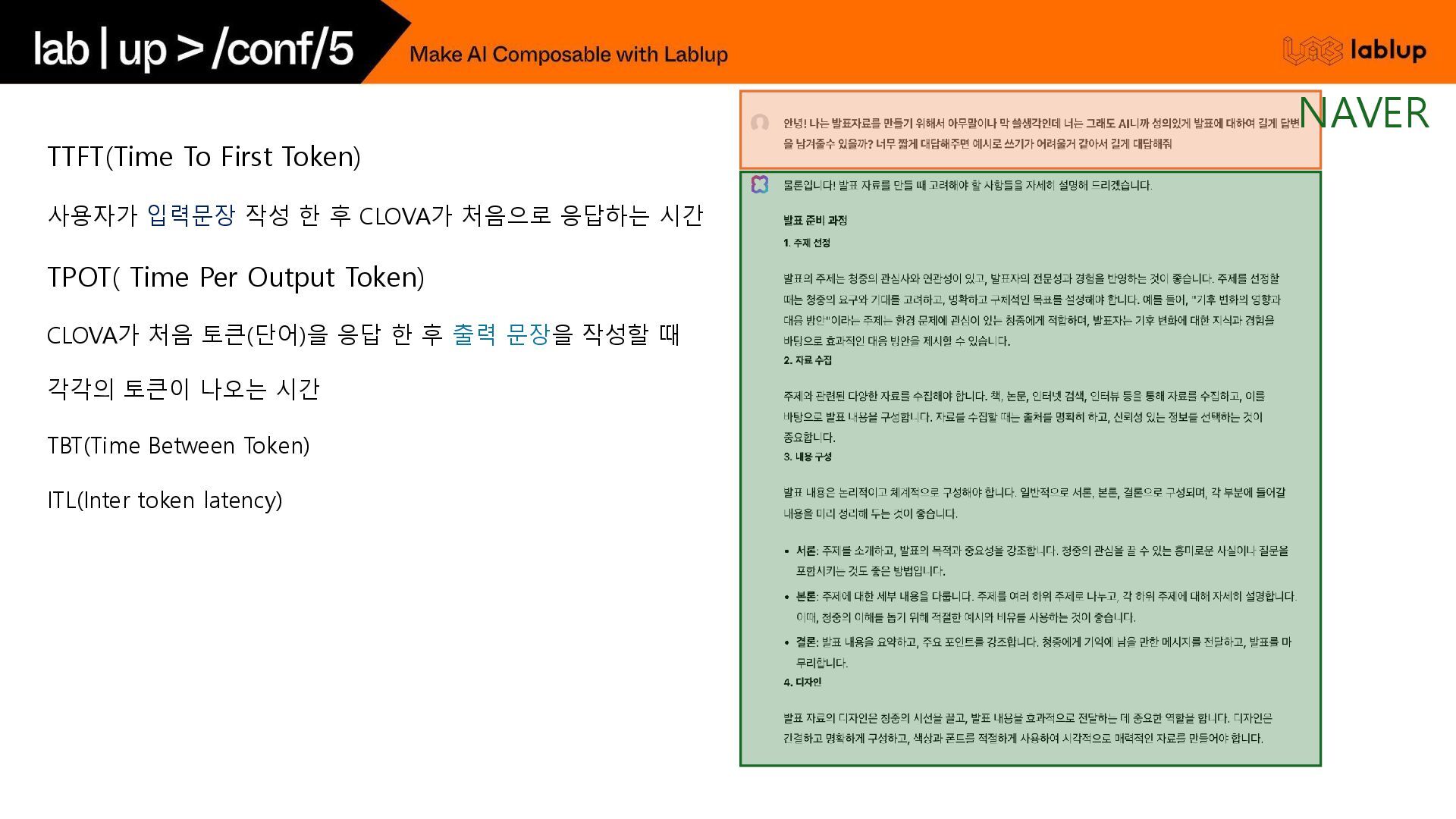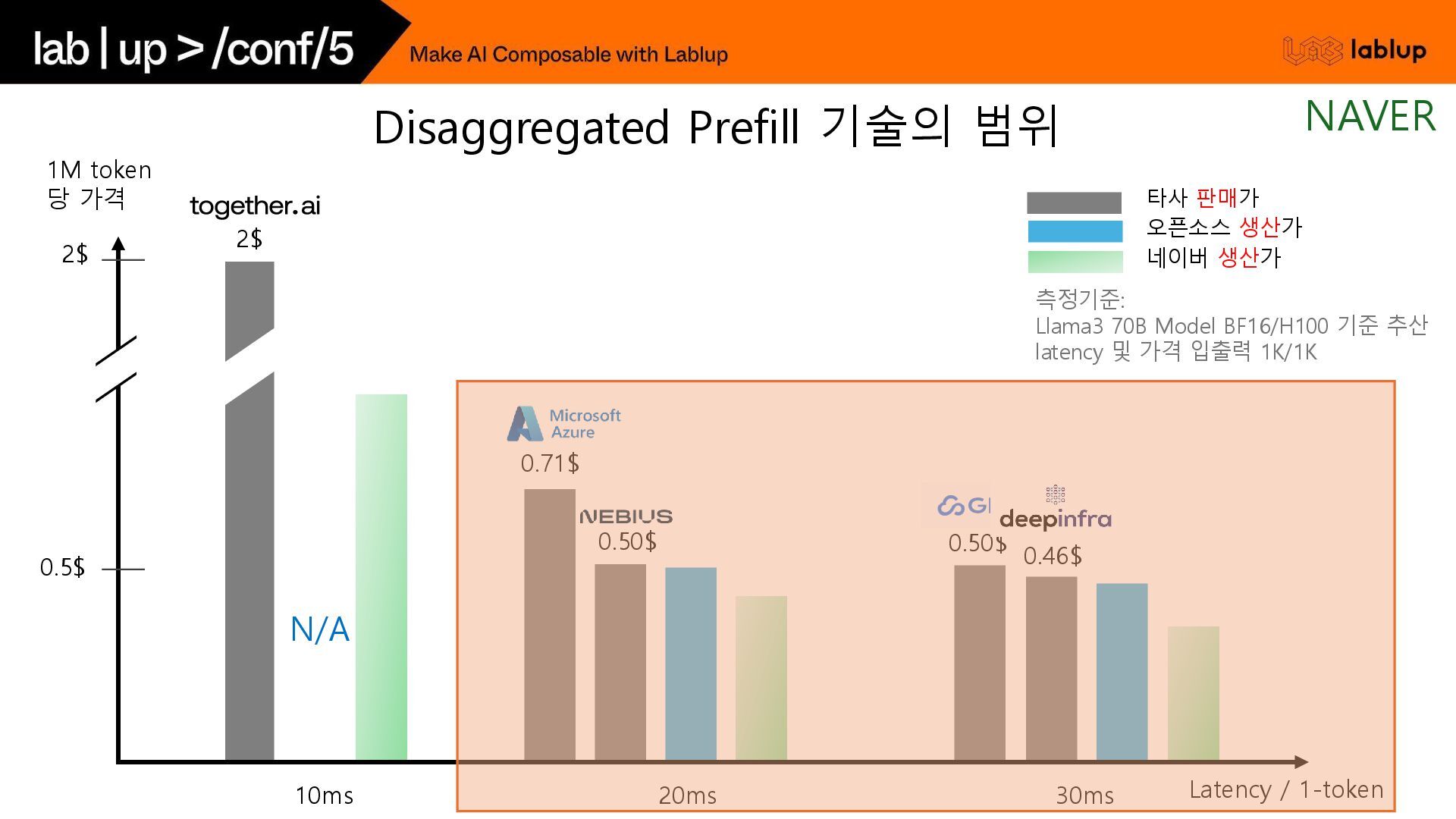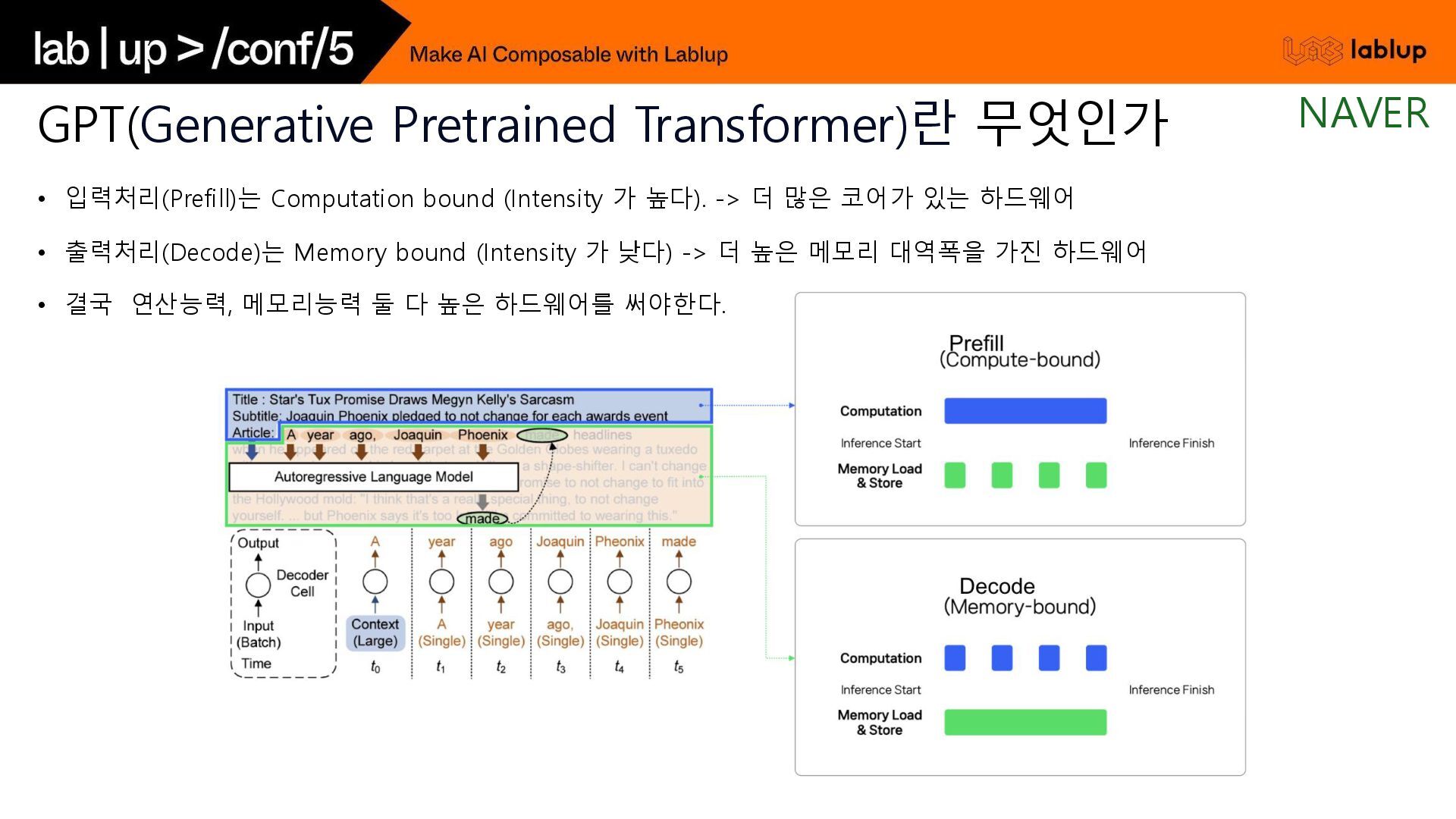 재연산하지 않고 KV load하여 연산시간을 줄임. - 연산을 생략하는 만큼 Prefill 비용감소 (~30%) 오늘 날씨 흐림 Time (2) 채팅 사용자 언제까지? 5시 오늘 날씨 흐림 언제까지? 5시 오늘 날씨 흐림 우산? yes 연산 생략 (KV Load) 사용자 입력 (Prefill) GPT 출력 (Decode) GPT는 욕을 하지 않는다. 오늘 날씨 알려줘. 흐림 GPT는 욕을 하지 않는다. Time (1) 중복 사용되는 시스템 프롬프트 사용자 입력 (Prefill) GPT 출력 (Decode) 음식점 추천해줘. 고깃집 연산 생략 (KV Load) Prefix Caching NAVER