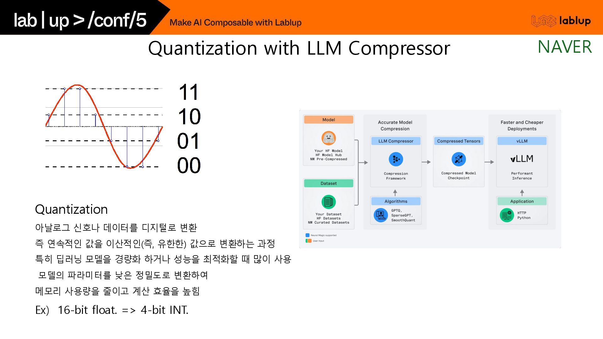 유한한) 값으로 변환하는 과정 특히 딥러닝 모델을 경량화 하거나 성능을 최적화할 때 많이 사용 모델의 파라미터를 낮은 정밀도로 변환하여 메모리 사용량을 줄이고 계산 효율을 높힘 Ex) 16-bit float. => 4-bit INT. Quantization with LLM Compressor NAVER