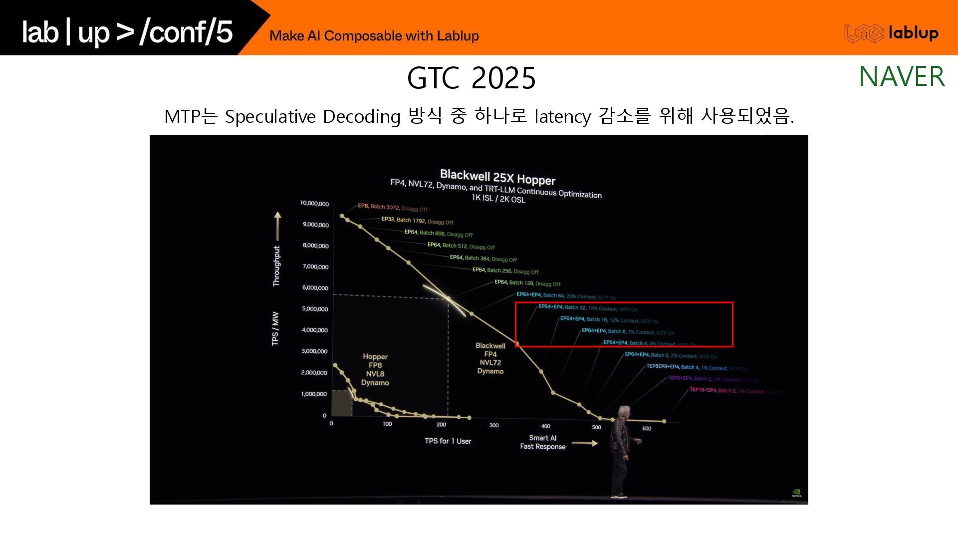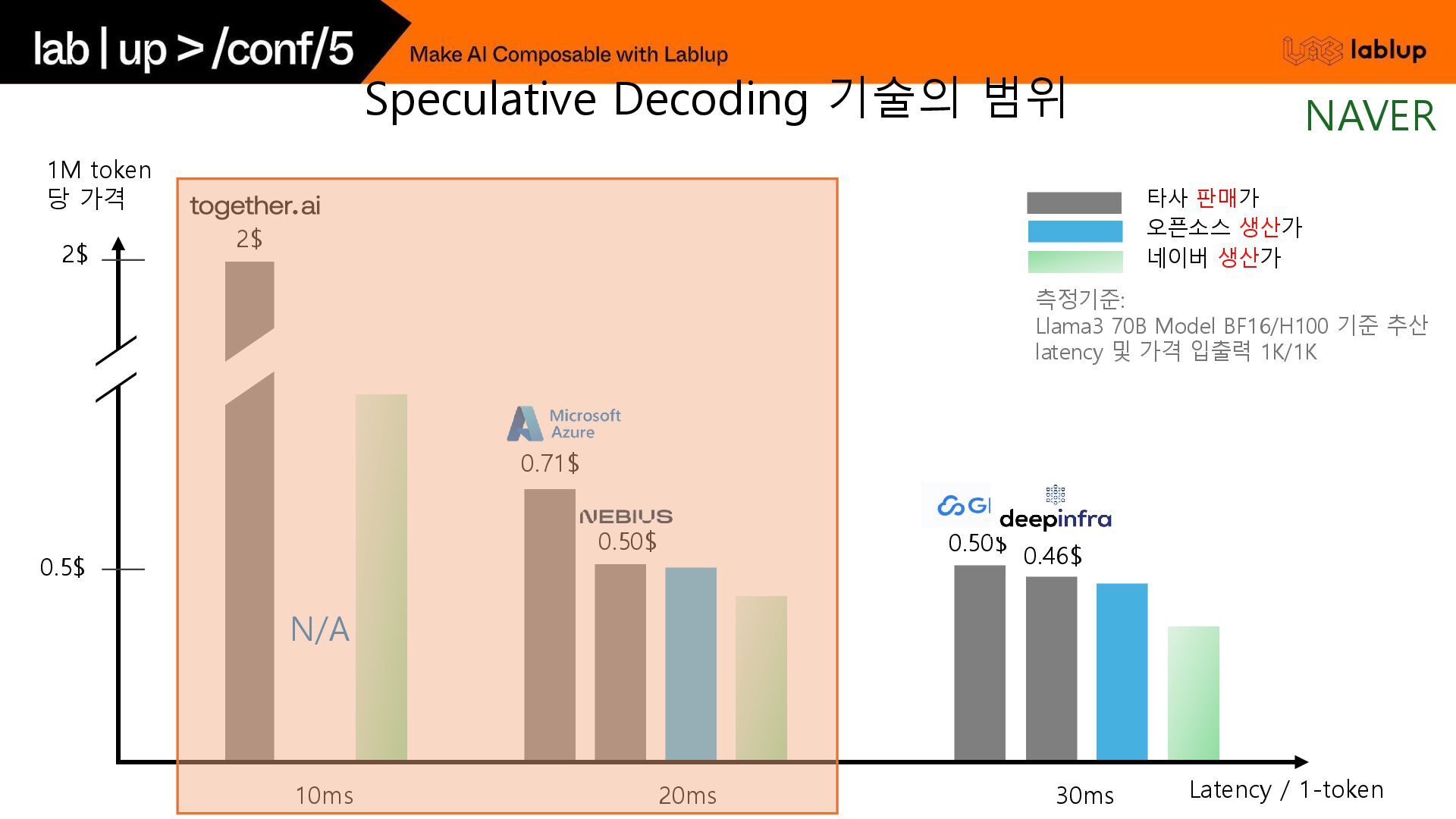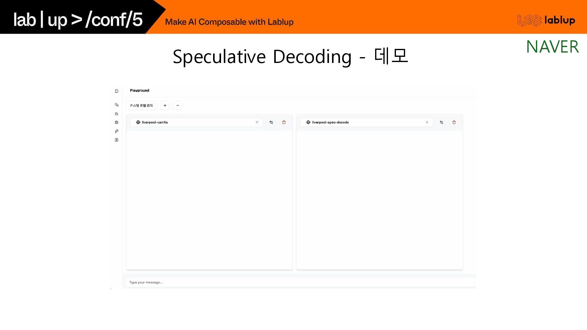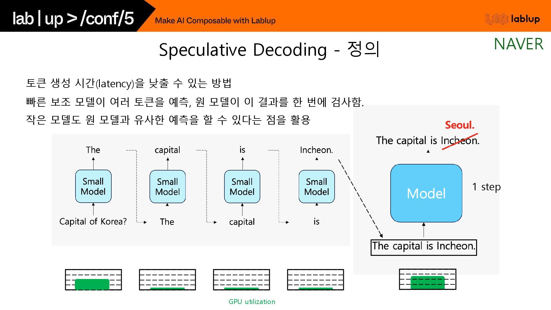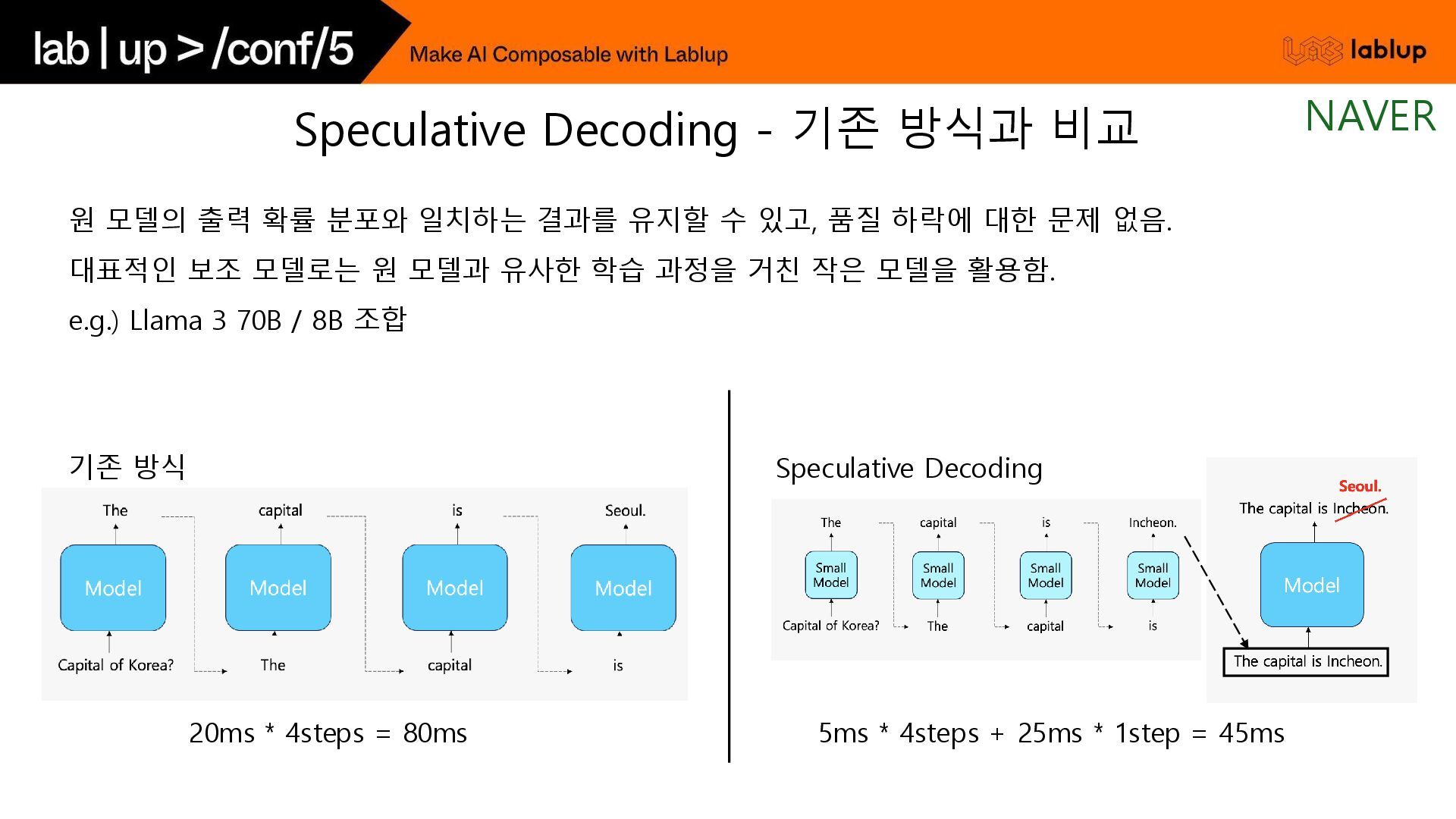 * 1step = 45ms 원 모델의 출력 확률 분포와 일치하는 결과를 유지할 수 있고, 품질 하락에 대한 문제 없음. 대표적인 보조 모델로는 원 모델과 유사한 학습 과정을 거친 작은 모델을 활용함. e.g.) Llama 3 70B / 8B 조합 기존 방식 Speculative Decoding Speculative Decoding - 기존 방식과 비교 NAVER