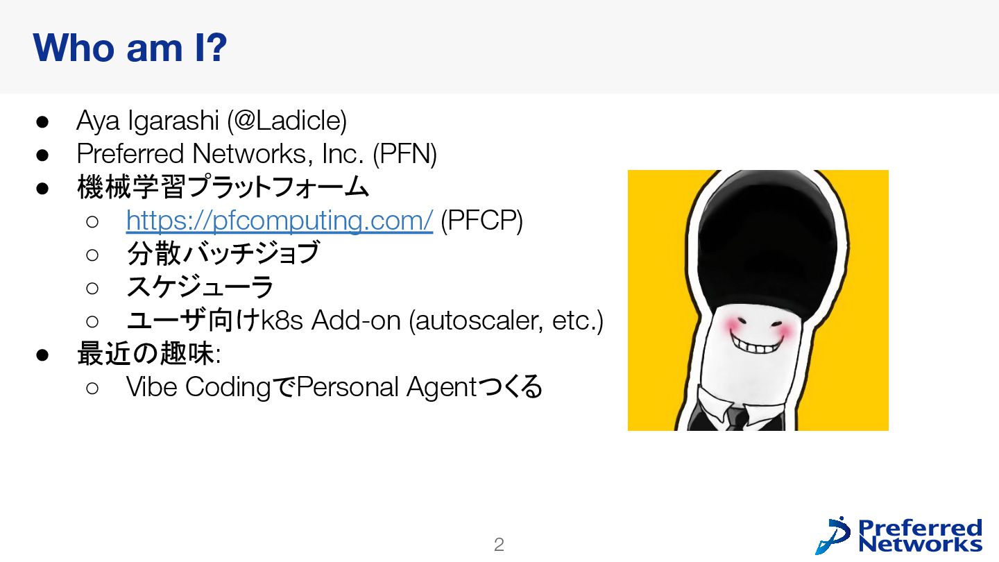 Networks, Inc. (PFN) • 機械学習プラットフォーム ◦ https://pfcomputing.com/ (PFCP) ◦ 分散バッチジョブ ◦ スケジューラ ◦ ユーザ向けk8s Add-on (autoscaler, etc.) • 最近の趣味: ◦ Vibe CodingでPersonal Agentつくる