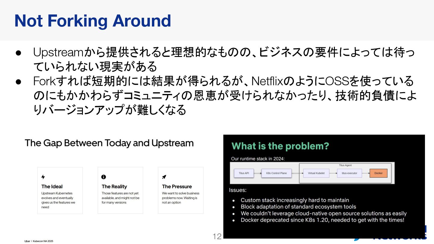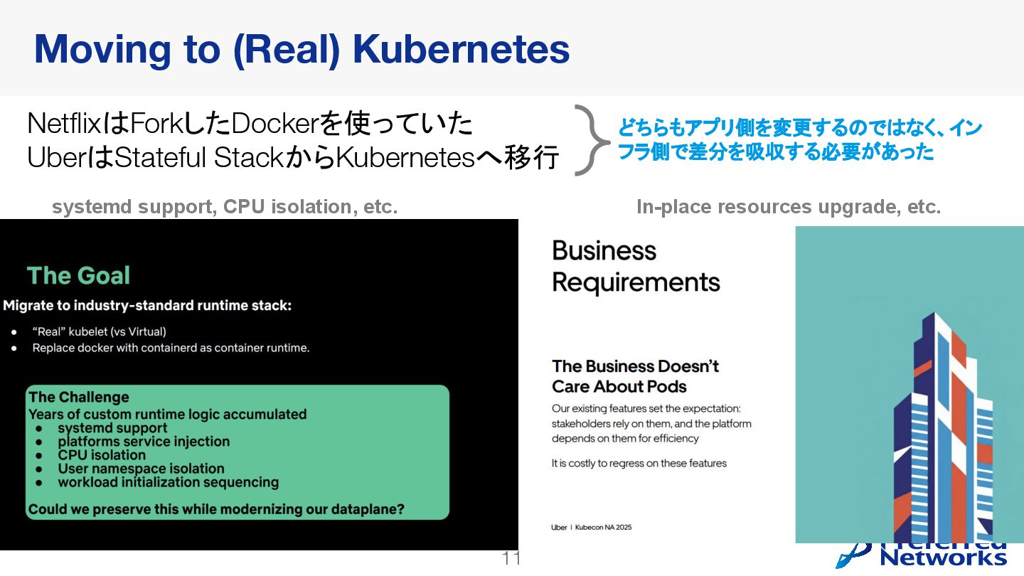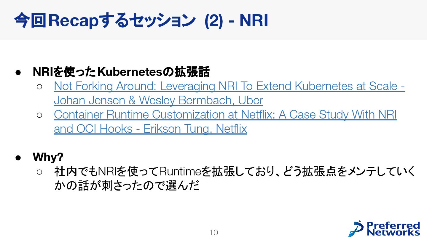 Extend Kubernetes at Scale - Johan Jensen & Wesley Bermbach, Uber ◦ Container Runtime Customization at Netflix: A Case Study With NRI and OCI Hooks - Erikson Tung, Netflix • Why? ◦ 社内でもNRIを使ってRuntimeを拡張しており、どう拡張点をメンテしていく かの話が刺さったので選んだ 今回Recapするセッション (2) - NRI