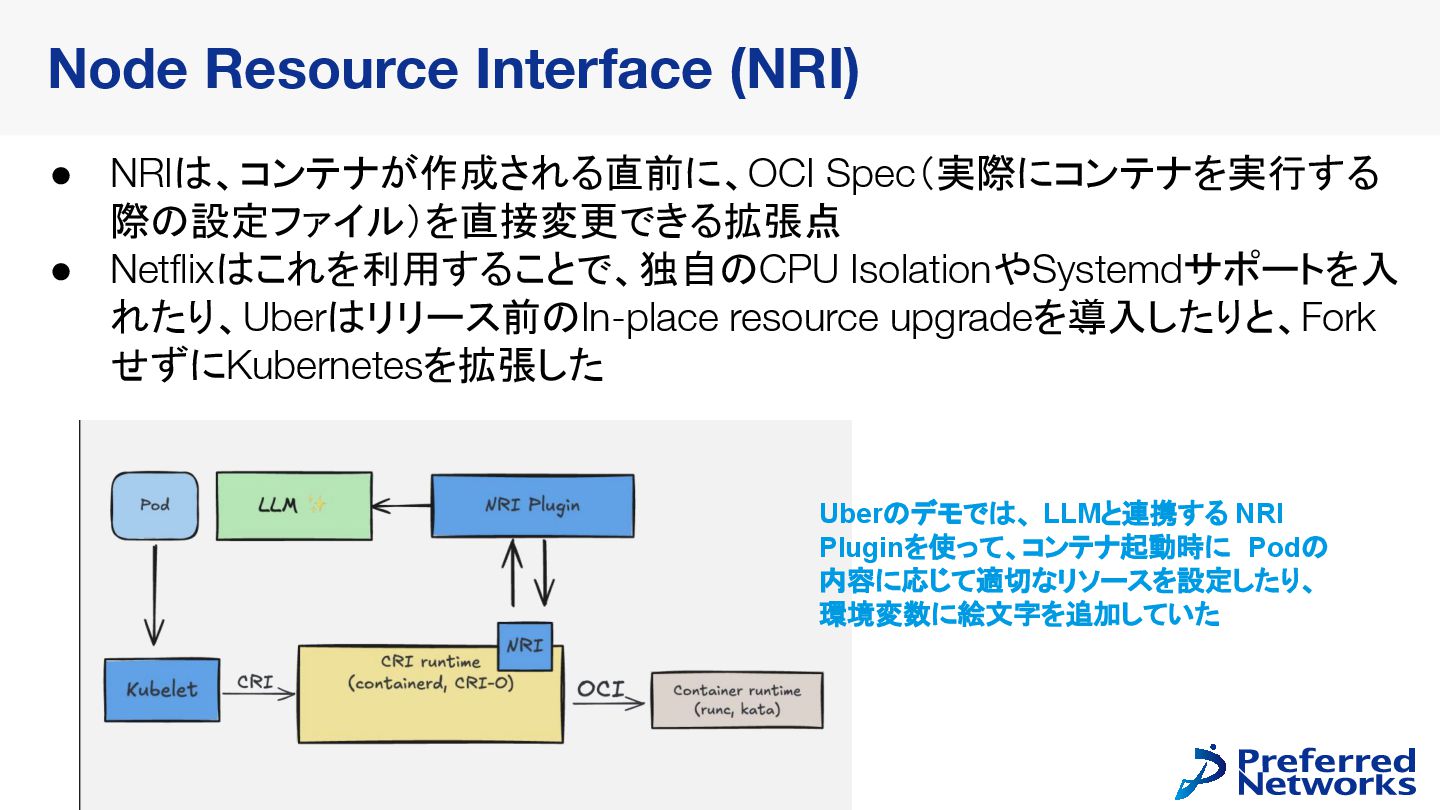 6. 13 • NRIは、コンテナが作成される直前に、OCI Spec(実際にコンテナを実行する 際の設定ファイル)を直接変更できる拡張点 • Netflixはこれを利用することで、独自のCPU IsolationやSystemdサポートを入 れたり、Uberはリリース前のIn-place resource