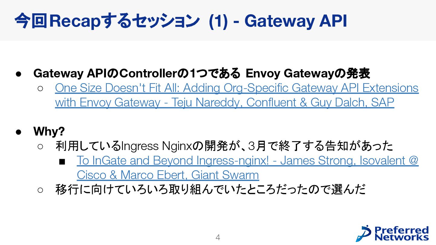 Fit All: Adding Org-Specific Gateway API Extensions with Envoy Gateway - Teju Nareddy, Confluent & Guy Dalch, SAP • Why? ◦ 利用しているIngress Nginxの開発が、3月で終了する告知があった ▪ To InGate and Beyond Ingress-nginx! - James Strong, Isovalent @ Cisco & Marco Ebert, Giant Swarm ◦ 移行に向けていろいろ取り組んでいたところだったので選んだ 今回Recapするセッション (1) - Gateway API