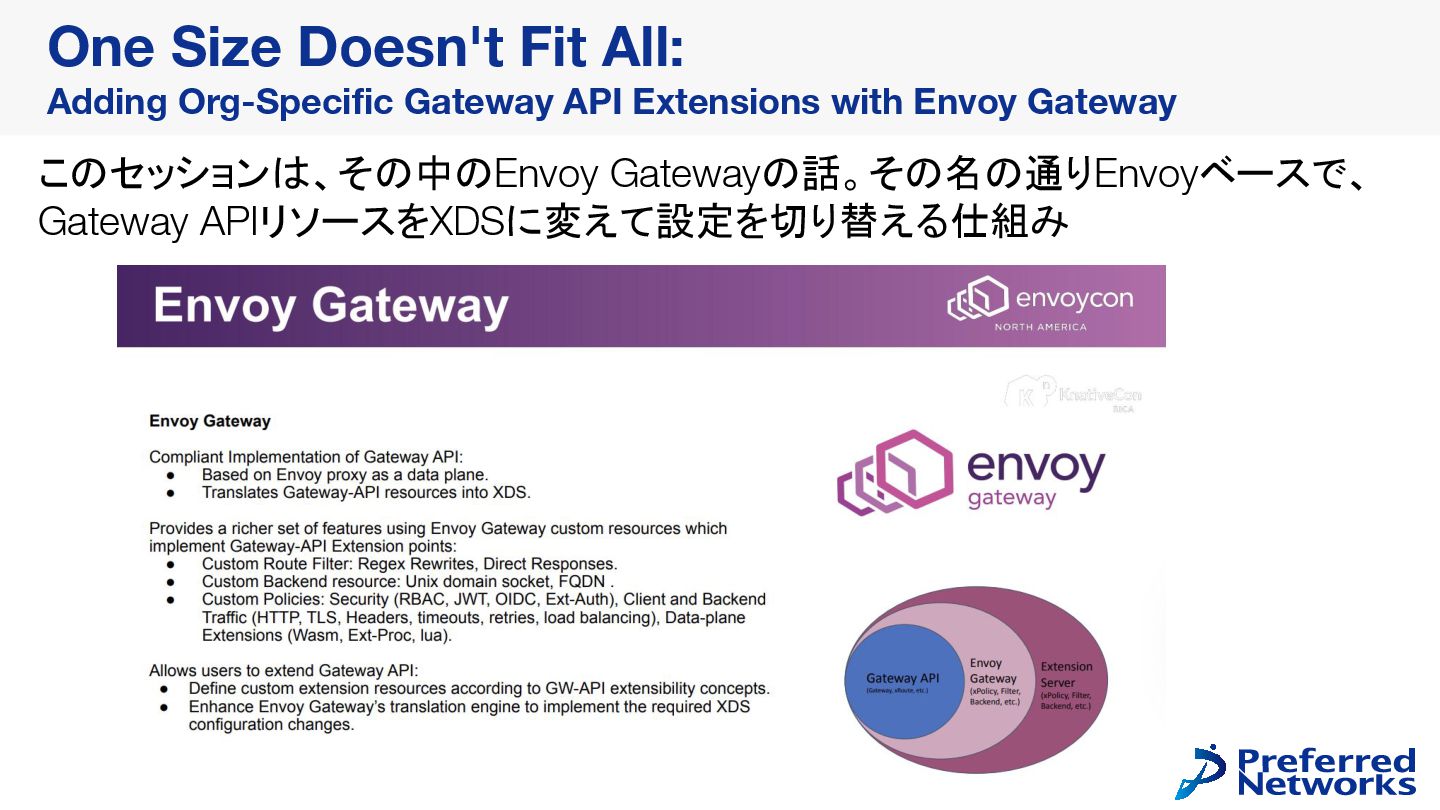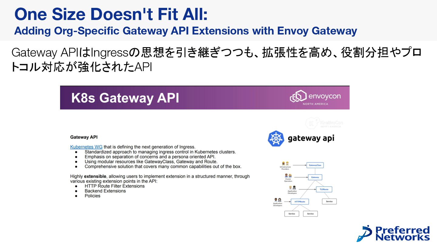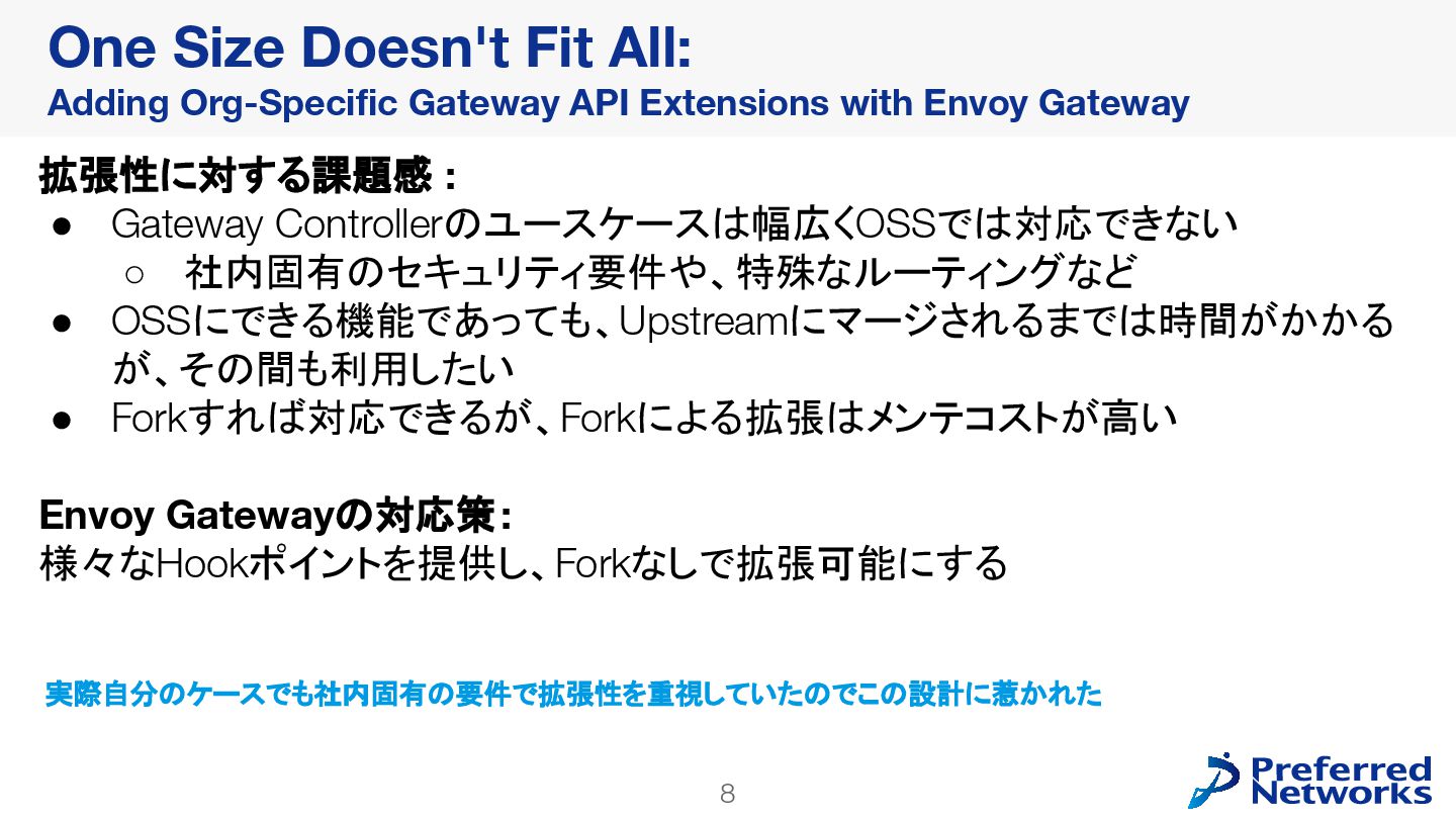が、その間も利用したい • Forkすれば対応できるが、Forkによる拡張はメンテコストが高い Envoy Gatewayの対応策: 様々なHookポイントを提供し、Forkなしで拡張可能にする One Size Doesn't Fit All: Adding Org-Specific Gateway API Extensions with Envoy Gateway 実際自分のケースでも社内固有の要件で拡張性を重視していたのでこの設計に惹かれた