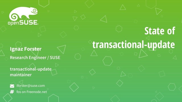 transactional-update is the default update mechanism on openSUSE Kubic and when using the "Transactional Server" role in openSUSE Leap or Tumbleweed. This talk is intended for both existing users and newcomers and will feature the following contents: