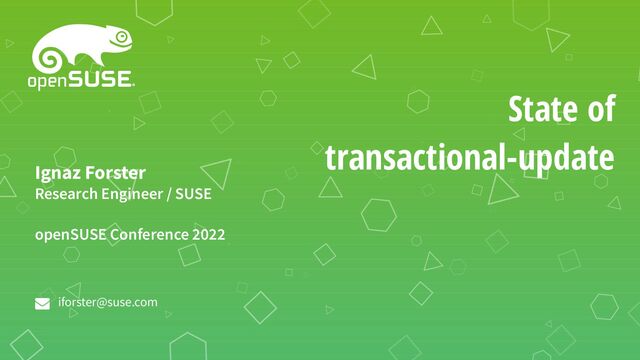 At lot of things have changed internally since the last talk at oSC19: The core functionality has been rewritten in C++ (formerly Bash), including a C++ and C API and a D-Bus interface. From a user's perspective the transactional-update command line interface still looks the same, but we now have Cockpit and dnf integration.