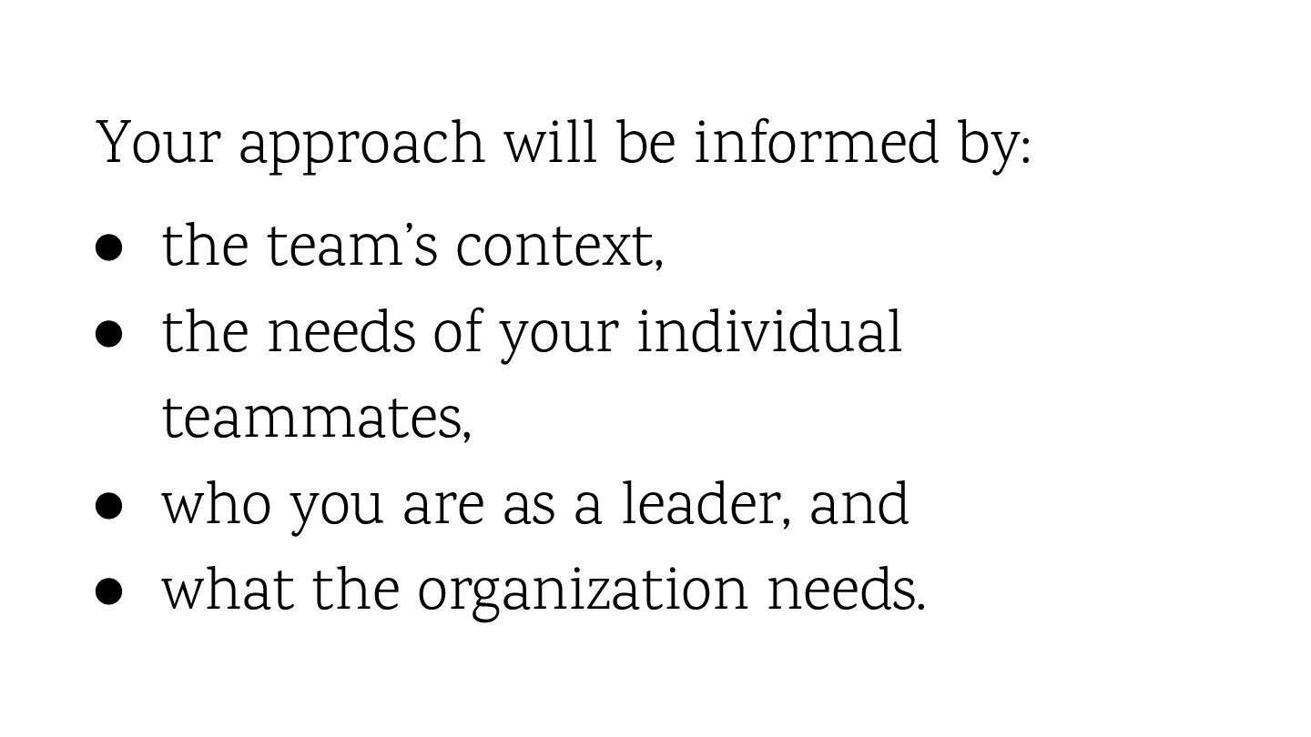 • the needs of your individual teammates, • who you are as a leader, and • what the organization needs.