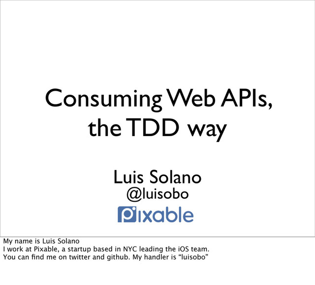 allDogs:^(NSArray *dogs) { capturedDogs = dogs; } failure:^(NSError *error) { }]; [[expectFutureValue(capturedDogs) shouldEventually] equal:@[@{@"name":@"perro",@"color":@"brown"}, @{@"name":@"tomas",@"color":@"black"} ]]; }); BAM! We have our first test Raise you hand if you see any problems with this test What is wrong with it? It’s hitting the real network: undeterministic, slow dependency Real life test case Principle TDD: isolate code from undeterministic and slow depencencies.