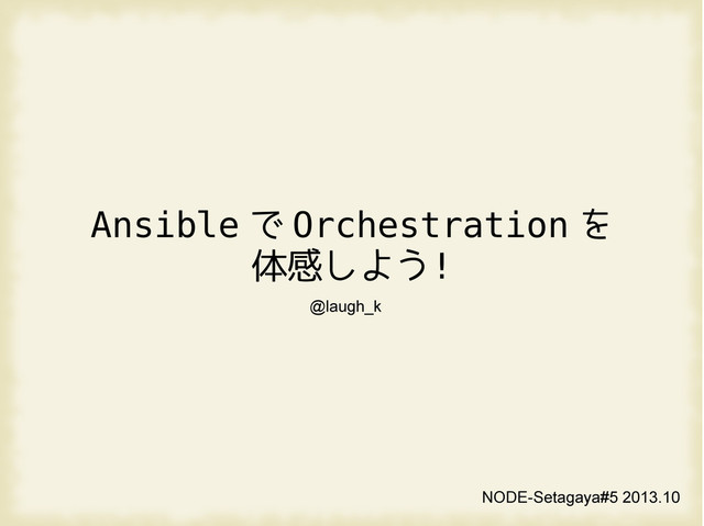 Ansible で Orchestration を ! 体感しよう NODE-Setagaya#5 2013.10 @laugh_k