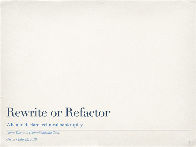 started over:" ✤ How long would it take to get to where we are now? Is this less or more time than getting totally out of debt?" ✤ Can we cope with a lack of visible forward progress for that amount of time?" ✤ Still need to fix critical and security bugs on old system" ✤ What makes us think a new system will be any better? !30