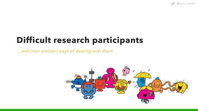 Lied on the screener! ★ Trying to make a profession out of being a research participant ★ Will skew your research findings ★ Say they use the tech or devices required but can’t in the session ✓ Compare previous answers to screeners ✓ Keep a blacklist - take note of names that respond regularly ✓ Always recruit a backup LITTLE MISS NAUGHTY Tips: