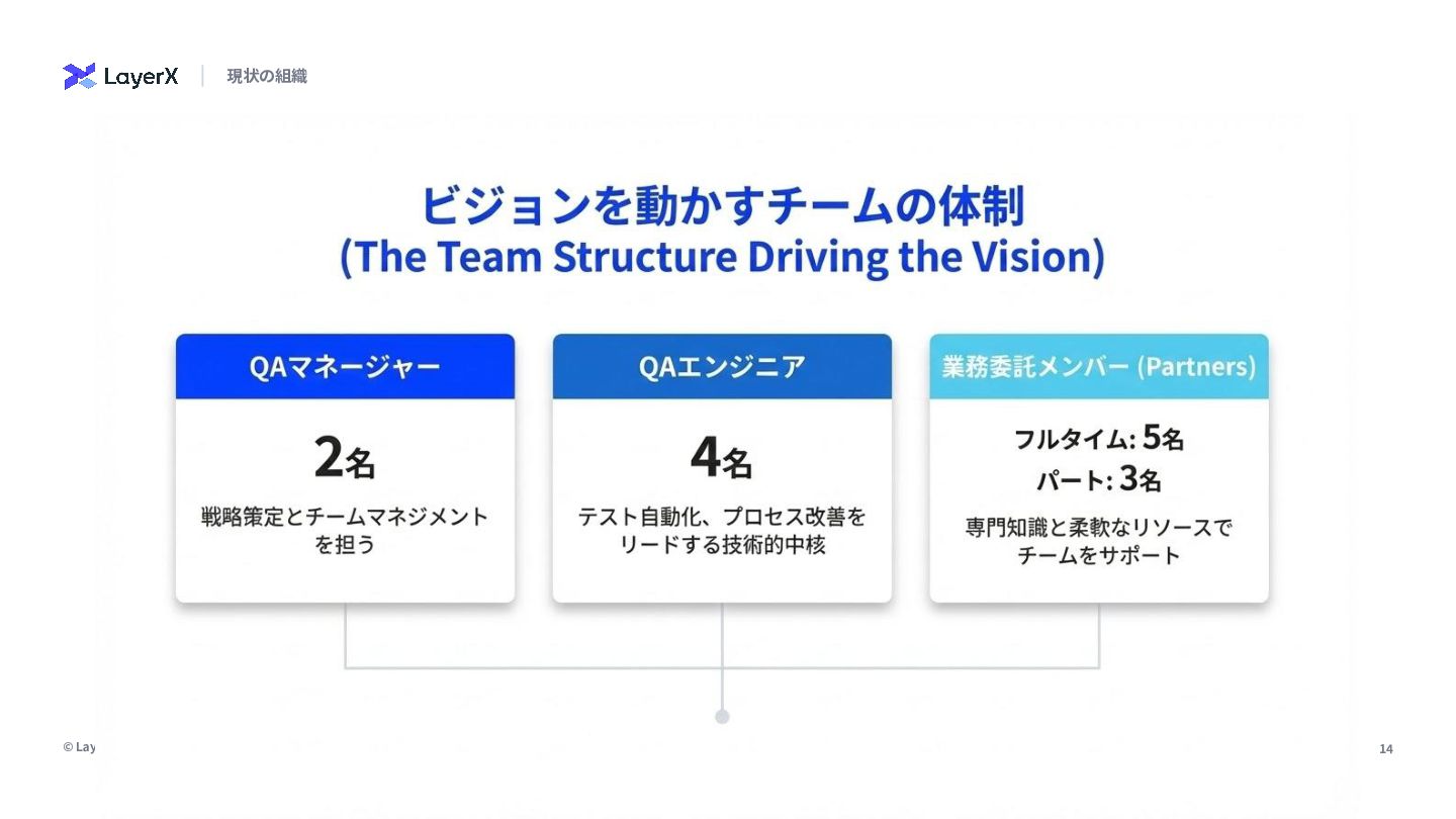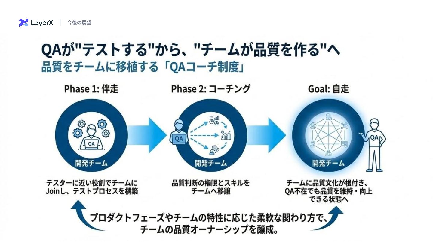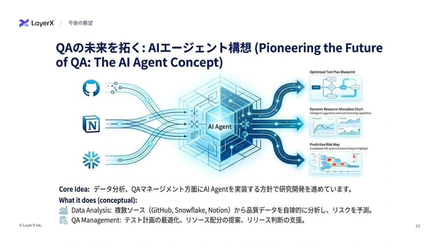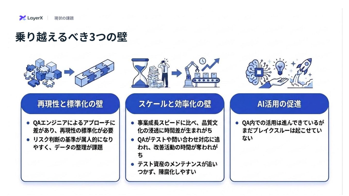 せ対応に追われ、改善活 動の時間が奪われがち • テスト資産のメンテナン スが追い陳腐化が発⽣し やすい • QAエンジニアによるア プロ差があり、再現性の 標準化が必要 • リスク判断の基準が属⼈ 的になりやすく、データ 点の整理が課題 • QA内での活⽤は進んで きているがまだブレイク スルーは起こせていない 再現性と標準化の壁 スケールと効率化の壁 AI活⽤の促進 現状の課題 乗り越えるべき3つの壁