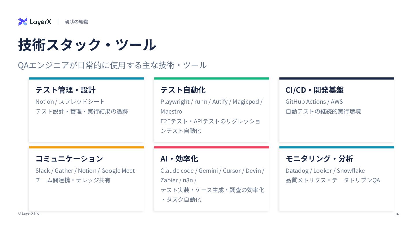 © LayerX Inc. 16 現状の組織 QAエンジニアが⽇常的に使⽤する主な技術‧ツール 技術スタック‧ツール テスト管理‧設計 Notion /