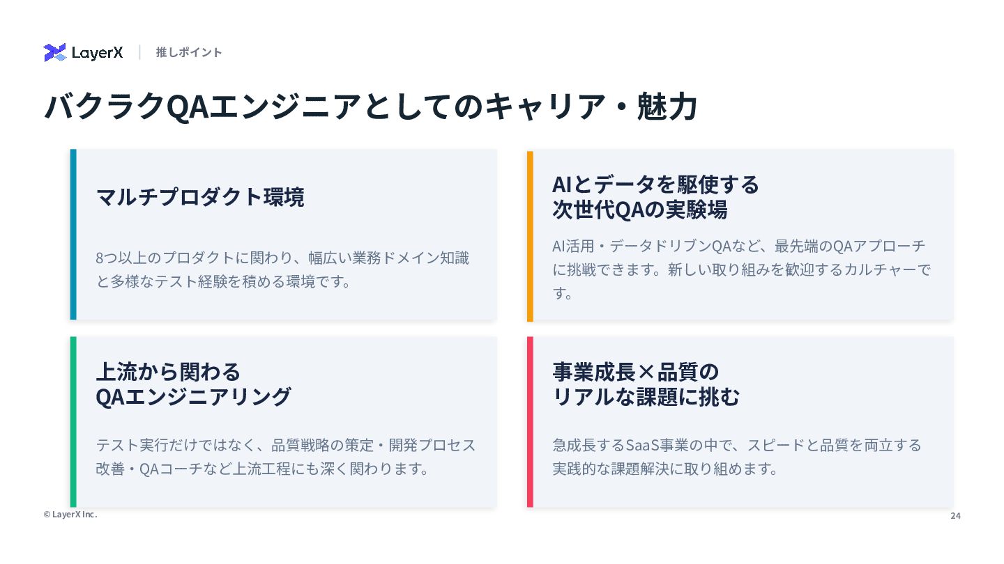 © LayerX Inc. 24 推しポイント バクラクQAエンジニアとしてのキャリア‧魅⼒ マルチプロダクト環境 8つ以上のプロダクトに関わり、幅広い業務ドメイン知識 と多様なテスト経験を積める環境です。 AIとデータを駆使する