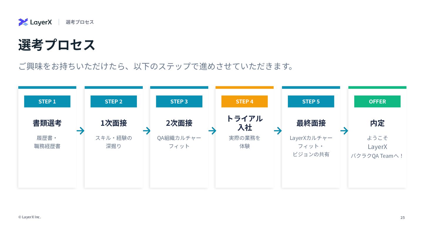 履歴書‧ 職務経歴書 STEP 2 1次⾯接 スキル‧経験の 深掘り STEP 4 トライアル ⼊社 実際の業務を 体験 STEP 5 最終⾯接 LayerXカルチャー フィット‧ ビジョンの共有 OFFER 内定 ようこそ LayerX バクラクQA Teamへ! STEP 3 2次⾯接 QA組織カルチャー フィット