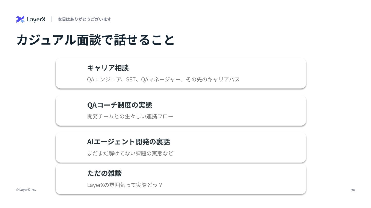© LayerX Inc. 26 本⽇はありがとうございます カジュアル⾯談で話せること AIエージェント開発の裏話 まだまだ解けてない課題の実態など QAコーチ制度の実態 開発チームとの⽣々しい連携フロー