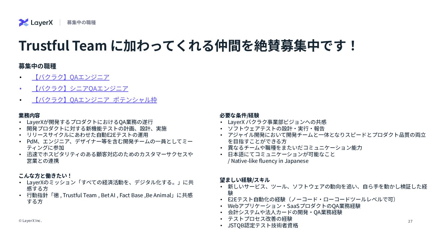 LayerXが開発するプロダクトにおけるQA業務の遂⾏ • 開発プロダクトに対する新機能テストの計画、設計、実施 • リリースサイクルにあわせた⾃動E2Eテストの運⽤ • PdM、エンジニア、デザイナー等を含む開発チームの⼀員としてミー ティングに参加 • 迅速でホスピタリティのある顧客対応のためのカスタマーサクセスや 営業との連携 こんな⽅と働きたい! • LayerXのミッション「すべての経済活動を、デジタル化する。」に共 感する⽅ • ⾏動指針「徳 , Trustful Team , Bet AI , Fact Base ,Be Animal」に共感 する⽅ 必要な条件/経験 • LayerX バクラク事業部ビジョンへの共感 • ソフトウェアテストの設計‧実⾏‧報告 • アジャイル開発において開発チームと⼀体となりスピードとプロダクト品質の両⽴ を⽬指すことができる⽅ • 異なるチームや職種をまたいだコミュニケーション能⼒ • ⽇本語にてコミュニケーションが可能なこと / Native-like fluency in Japanese 望ましい経験/スキル • 新しいサービス、ツール、ソフトウェアの動向を追い、⾃ら⼿を動かし検証した経 験 • E2Eテスト⾃動化の経験(ノーコード‧ローコードツールレベルで可) • Webアプリケーション‧SaaSプロダクトのQA業務経験 • 会計システムや法⼈カードの開発‧QA業務経験 • テストプロセス改善の経験 • JSTQB認定テスト技術者資格 募集中の職種 • 【バクラク】QAエンジニア • 【バクラク】シニアQAエンジニア • 【バクラク】QAエンジニア_ポテンシャル枠