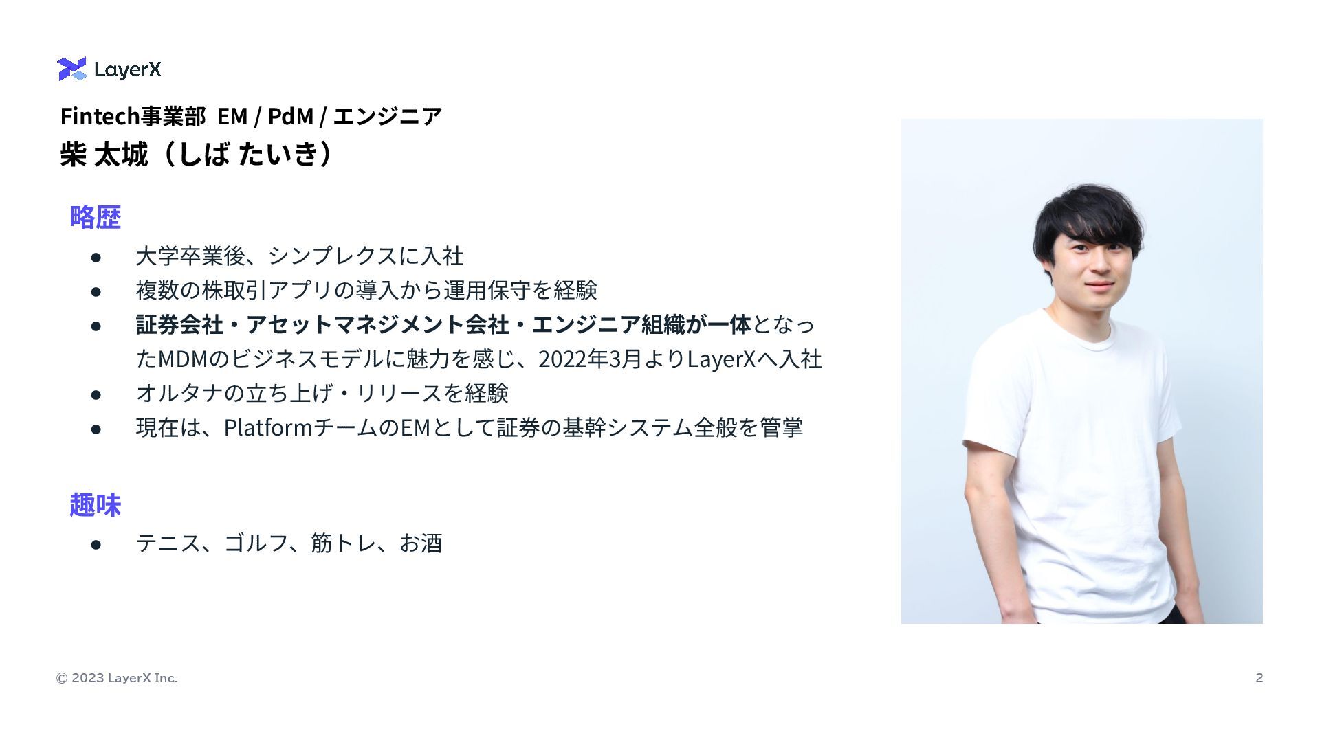 エンジニア 柴 太城(しば たいき) 略歴 • ⼤学卒業後、シンプレクスに⼊社 • 複数の株取引アプリの導⼊から運⽤保守を経験 • 証券会社‧アセットマネジメント会社‧エンジニア組織が⼀体となっ たMDMのビジネスモデルに魅⼒を感じ、2022年3⽉よりLayerXへ⼊社 • オルタナの⽴ち上げ‧リリースを経験 • 現在は、PlatformチームのEMとして証券の基幹システム全般を管掌 趣味 • テニス、ゴルフ、筋トレ、お酒