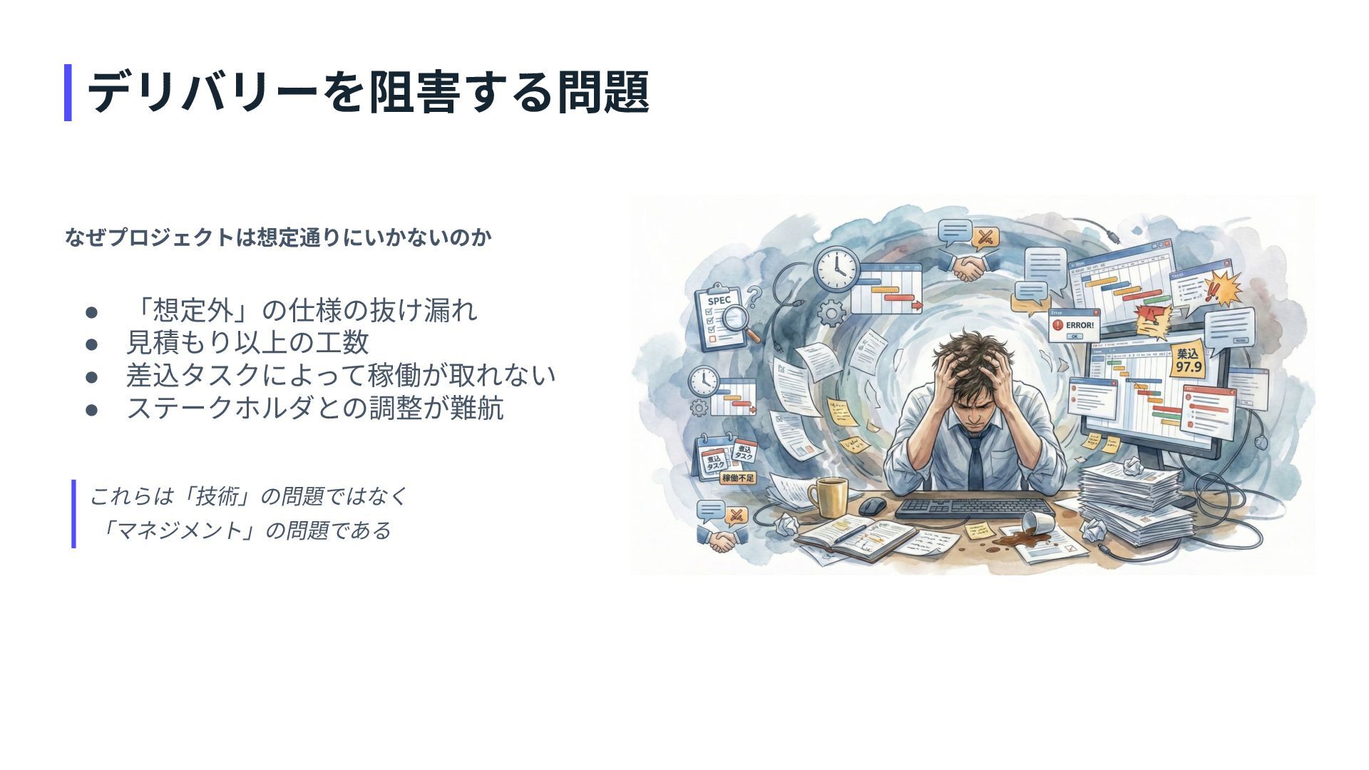 プロダクトエンジニアにとって、技術力と同じくらい重要なのがプロジェクトマネジメントスキルです。本セッションでは、デリバリーを阻害する「マネジメントの問題」を解決し、高速にユーザー価値を届け続けるための考え方と実践を共有します。