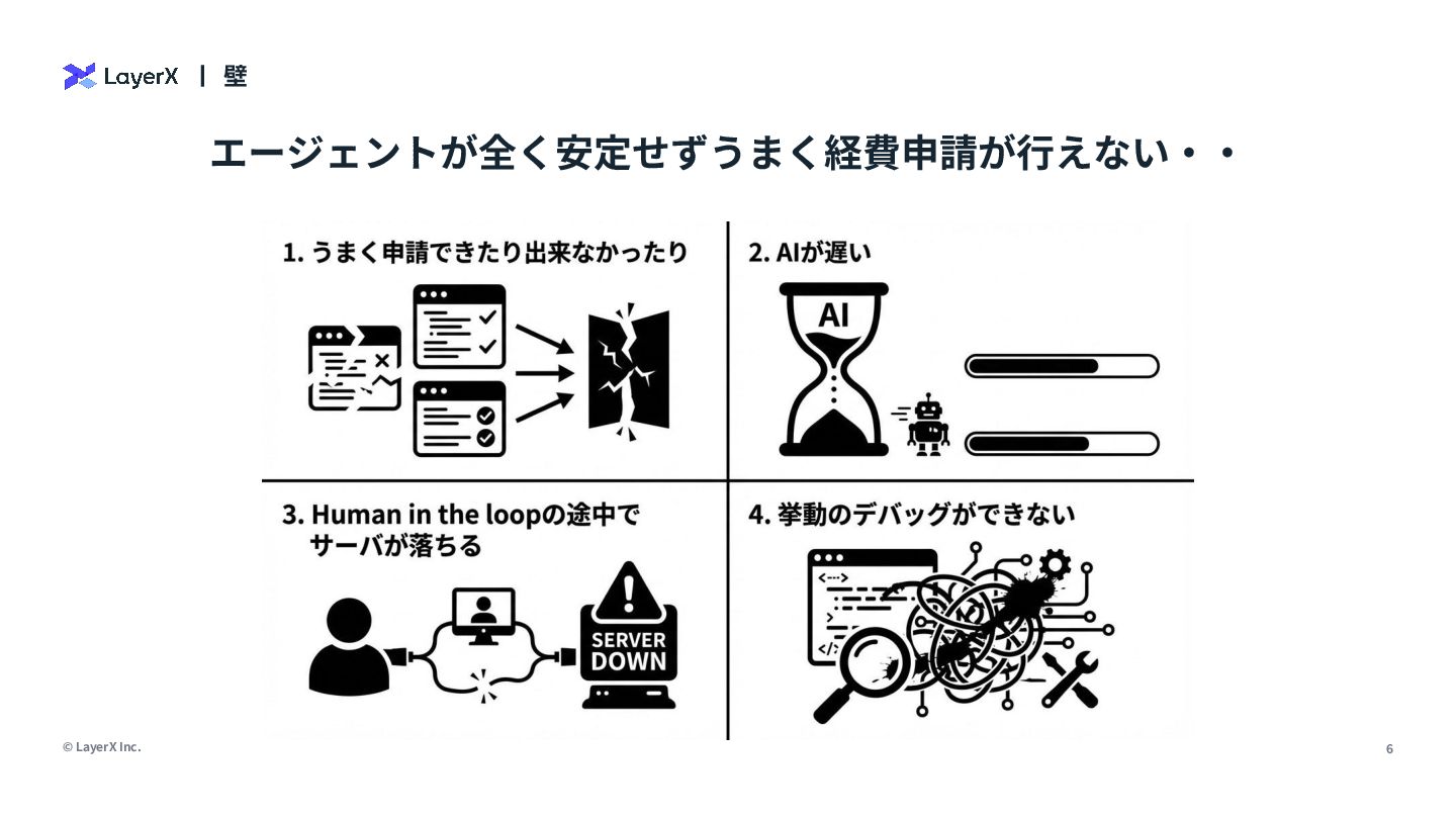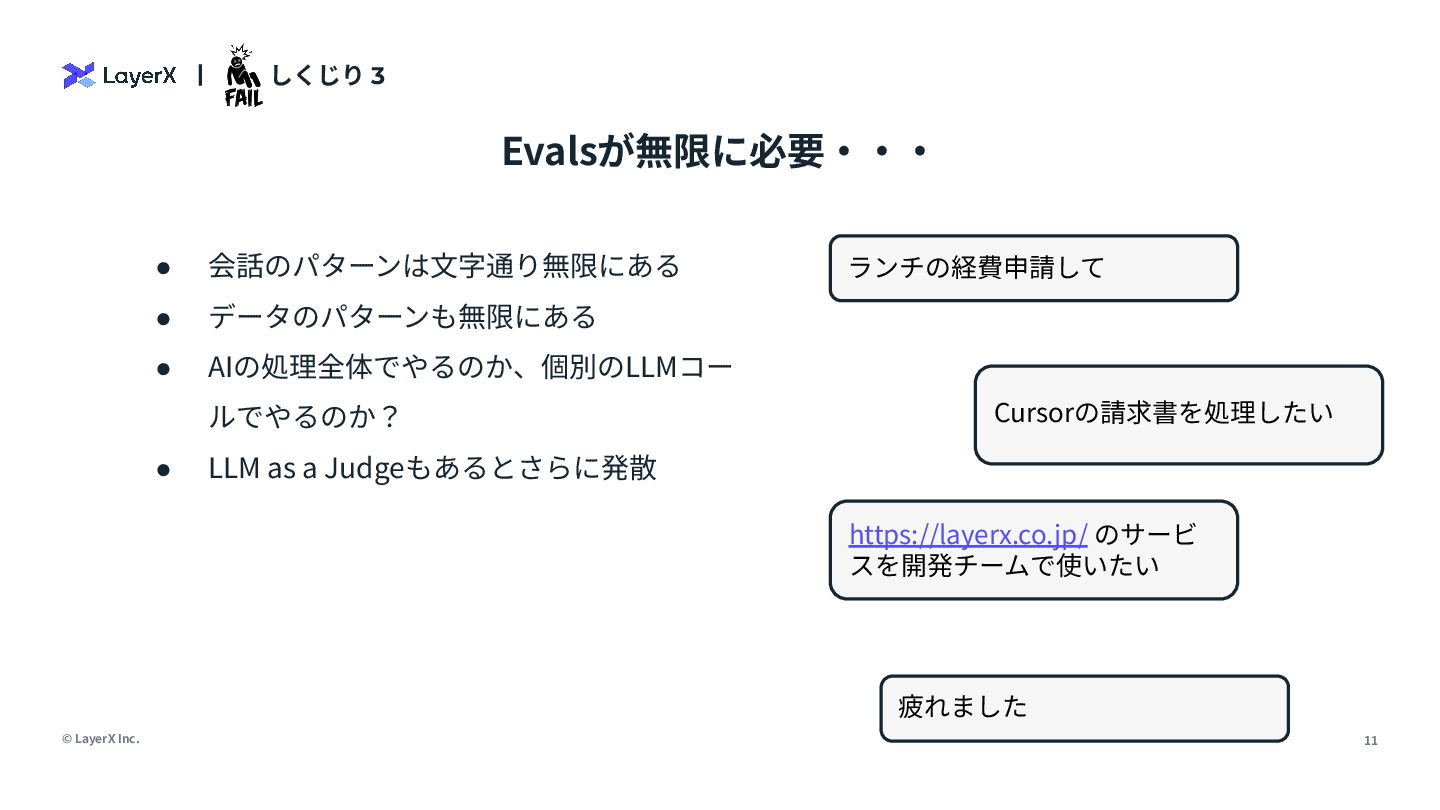 • AIの処理全体でやるのか、個別のLLMコー ルでやるのか? • LLM as a Judgeもあるとさらに発散 Evalsが無限に必要‧‧‧ ランチの経費申請して Cursorの請求書を処理したい https://layerx.co.jp/ のサービ スを開発チームで使いたい 疲れました