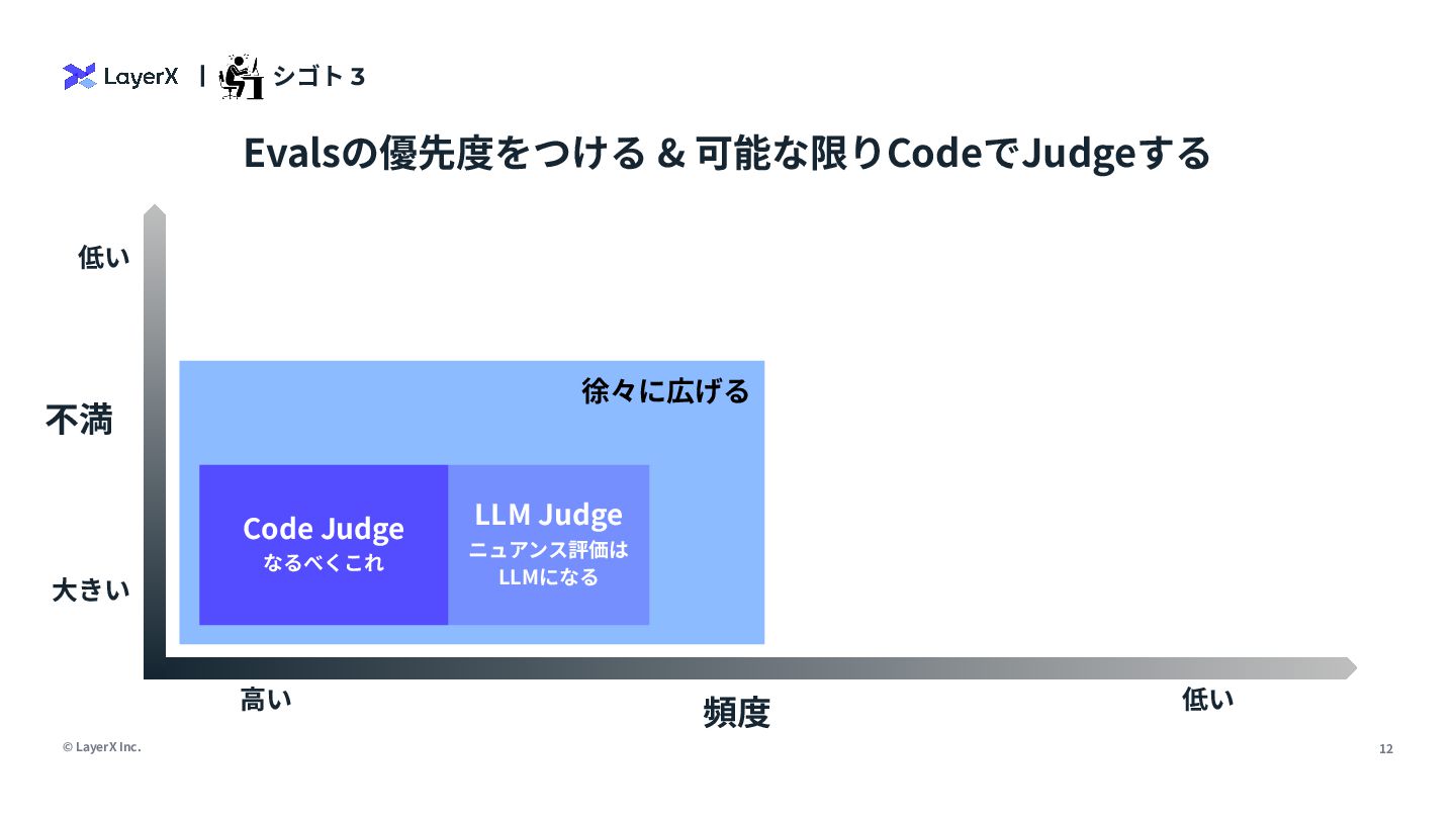 6. © LayerX Inc. 12 徐々に広げる   シゴト 3 Evalsの優先度をつける & 可能な限りCodeでJudgeする