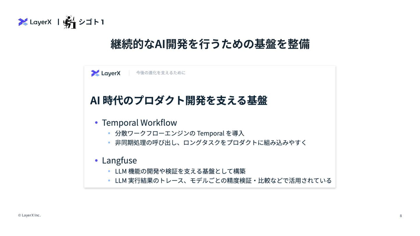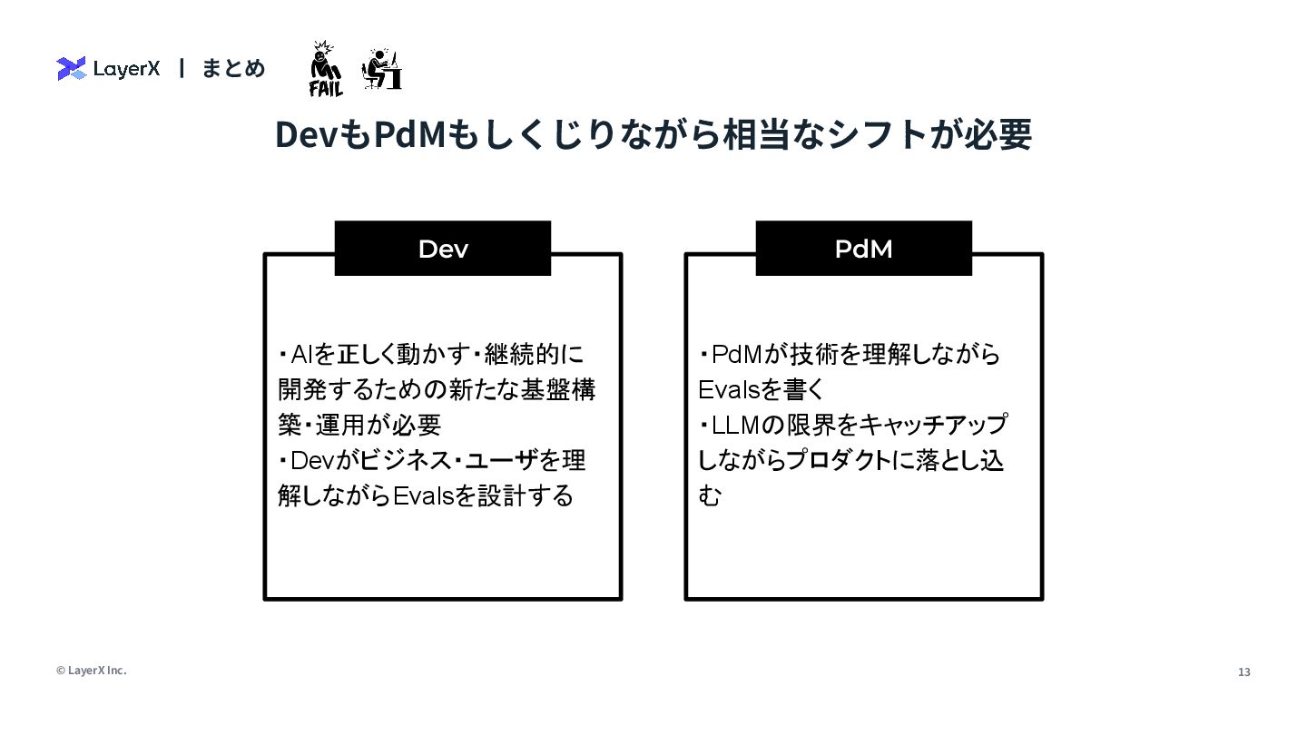 7. © LayerX Inc. 13 まとめ DevもPdMもしくじりながら相当なシフトが必要 ・AIを正しく動かす・継続的に 開発するための新たな基盤構 築・運用が必要 ・Devがビジネス・ユーザを理