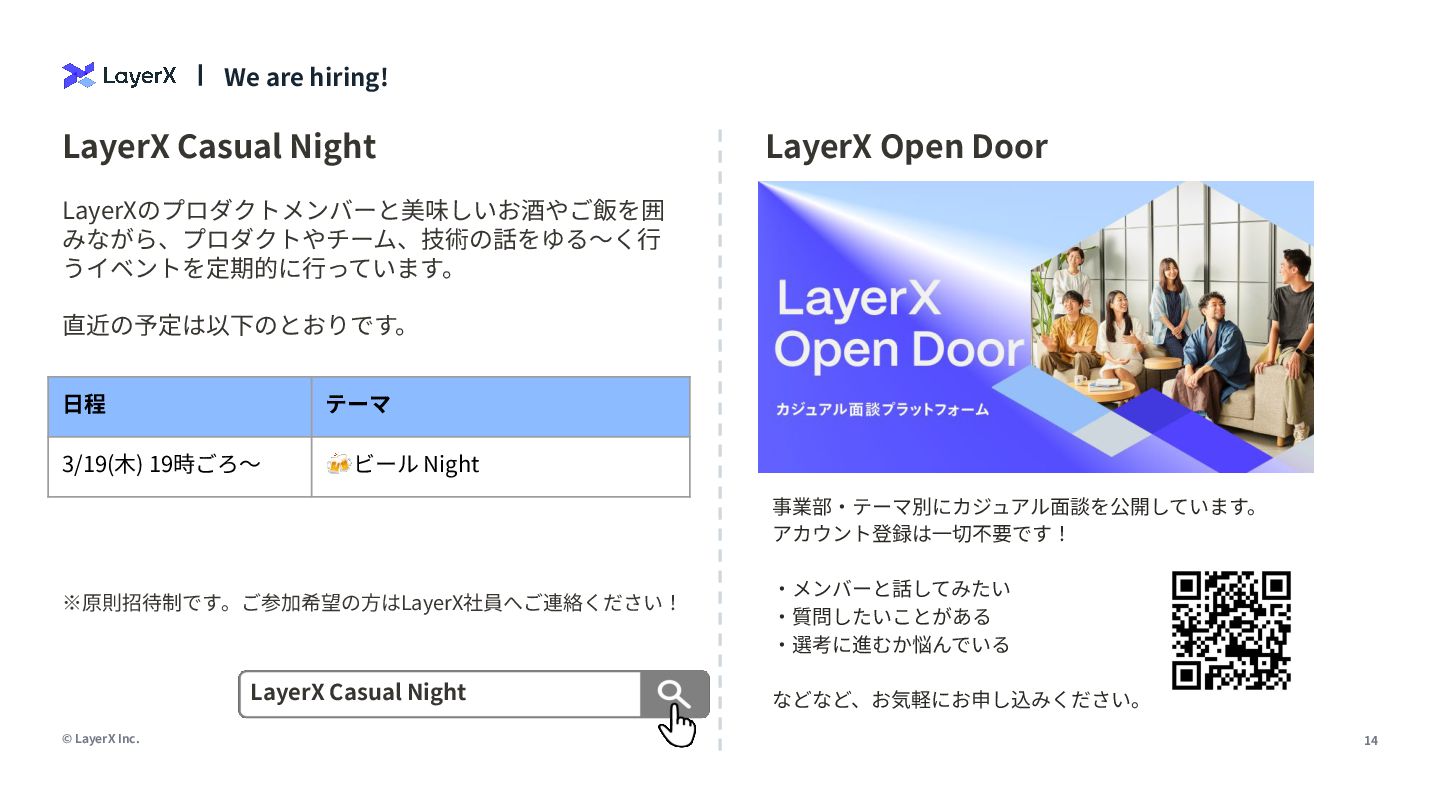 直近の予定は以下のとおりです。 LayerX Casual Night LayerX Casual Night LayerX Open Door 事業部‧テーマ別にカジュアル⾯談を公開しています。 アカウント登録は⼀切不要です! ‧メンバーと話してみたい ‧質問したいことがある ‧選考に進むか悩んでいる などなど、お気軽にお申し込みください。 ※原則招待制です。ご参加希望の⽅はLayerX社員へご連絡ください! ⽇程 テーマ 3/19(⽊) 19時ごろ〜 🍻ビール Night