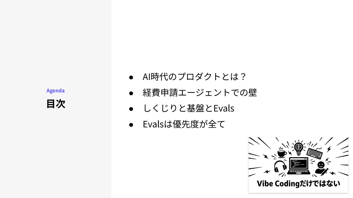 急成長するAIプロダクトの裏側で重要な役割を果たす「Evals(評価)」について解説をしたスライドです。