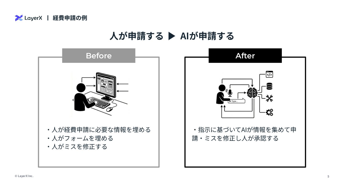 1. © LayerX Inc. 5 経費申請の例 ⼈が申請する AIが申請する Before After ‧⼈が経費申請に必要な情報を埋める