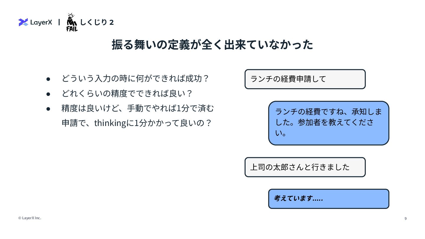 3. © LayerX Inc. 9   しくじり 2 • どういう⼊⼒の時に何ができれば成功? • どれくらいの精度でできれば良い?