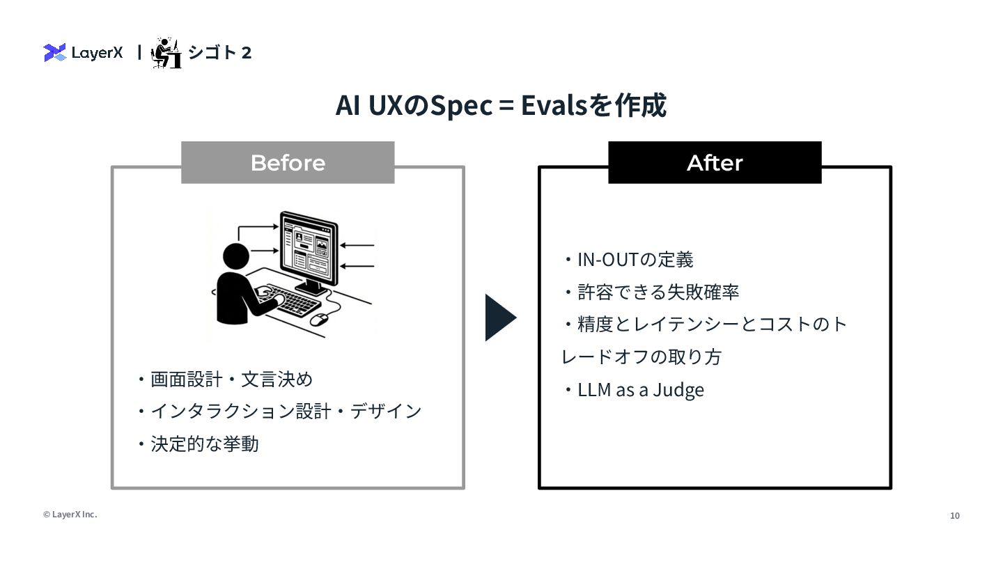 Before After ‧画⾯設計‧⽂⾔決め ‧インタラクション設計‧デザイン ‧決定的な挙動 ‧IN-OUTの定義 ‧許容できる失敗確率 ‧精度とレイテンシーとコストのト レードオフの取り⽅ ‧LLM as a Judge